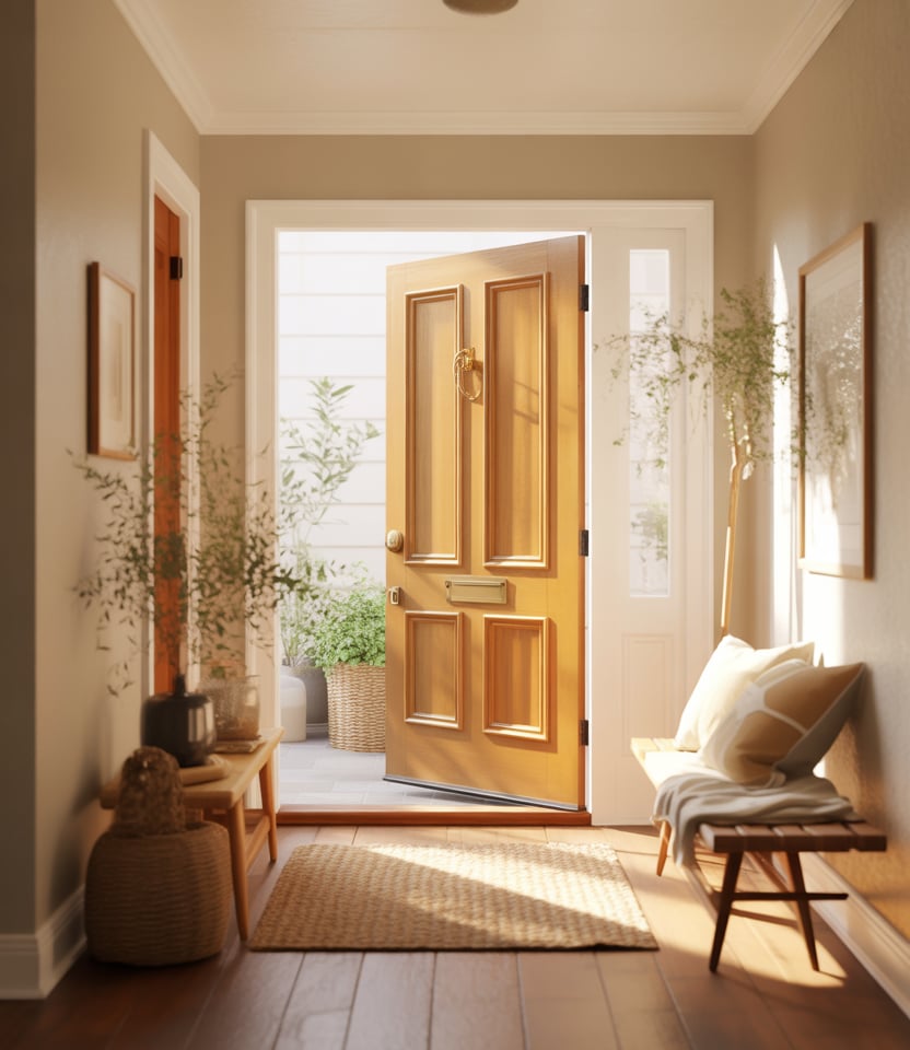 Golden tan doors are quietly rising as a welcoming front door color for 2026. They pair beautifully with gray house exteriors and natural stone, adding warmth without stealing attention. The look feels sunny, approachable, and timeless.