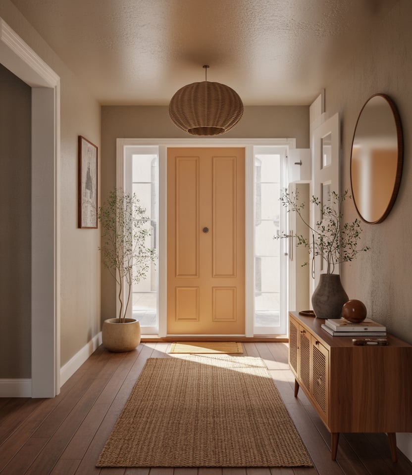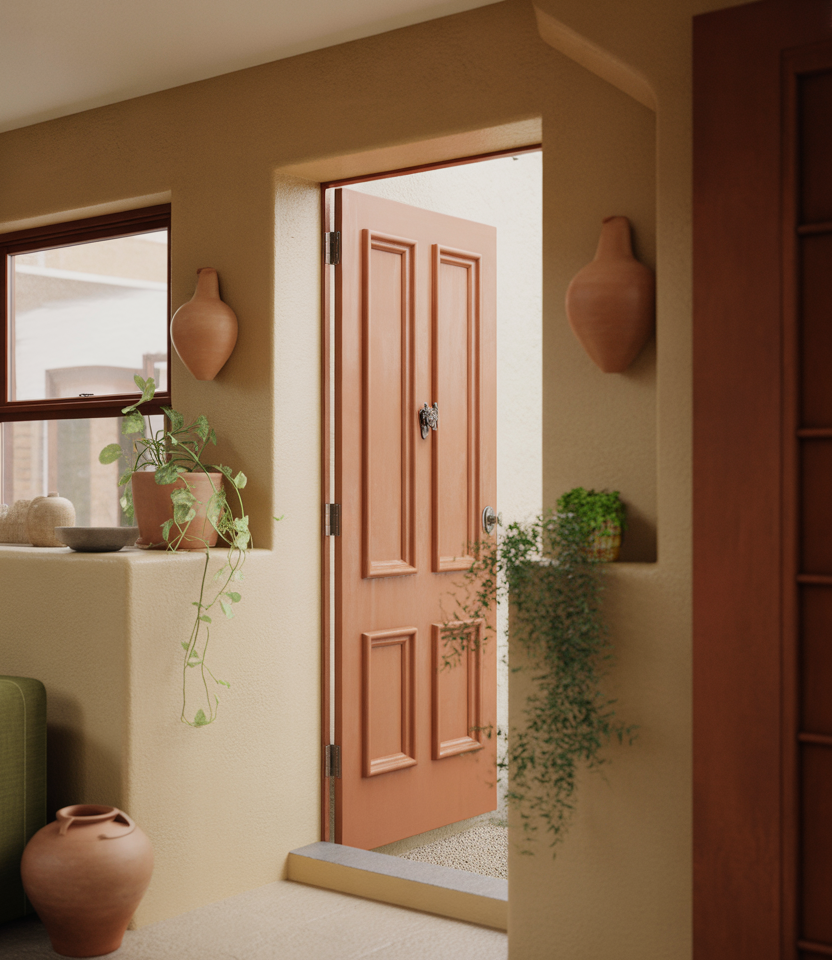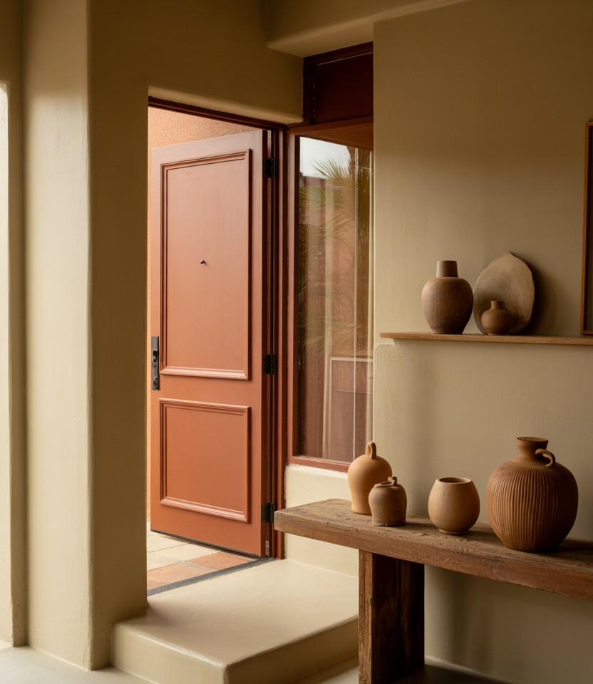 Soft terracotta tones are emerging as an unexpected but welcoming 2026 front door color option. These hues work beautifully on a tan house or homes with earthy materials, offering warmth without leaning rustic. The color feels sun-kissed, grounded, and quietly optimistic.