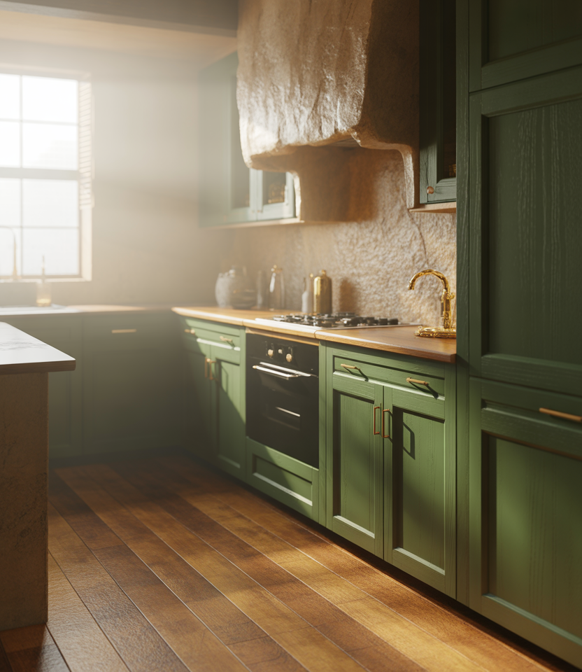 The richer shades of green are moving into kitchens with a grounded, organic feel in 2026. These cabinets appear with a natural wood floor and subtle stone accents. The effect is calm and confident, blending earthy tones with a slightly elevated and design-forward edge, but it is very simple.