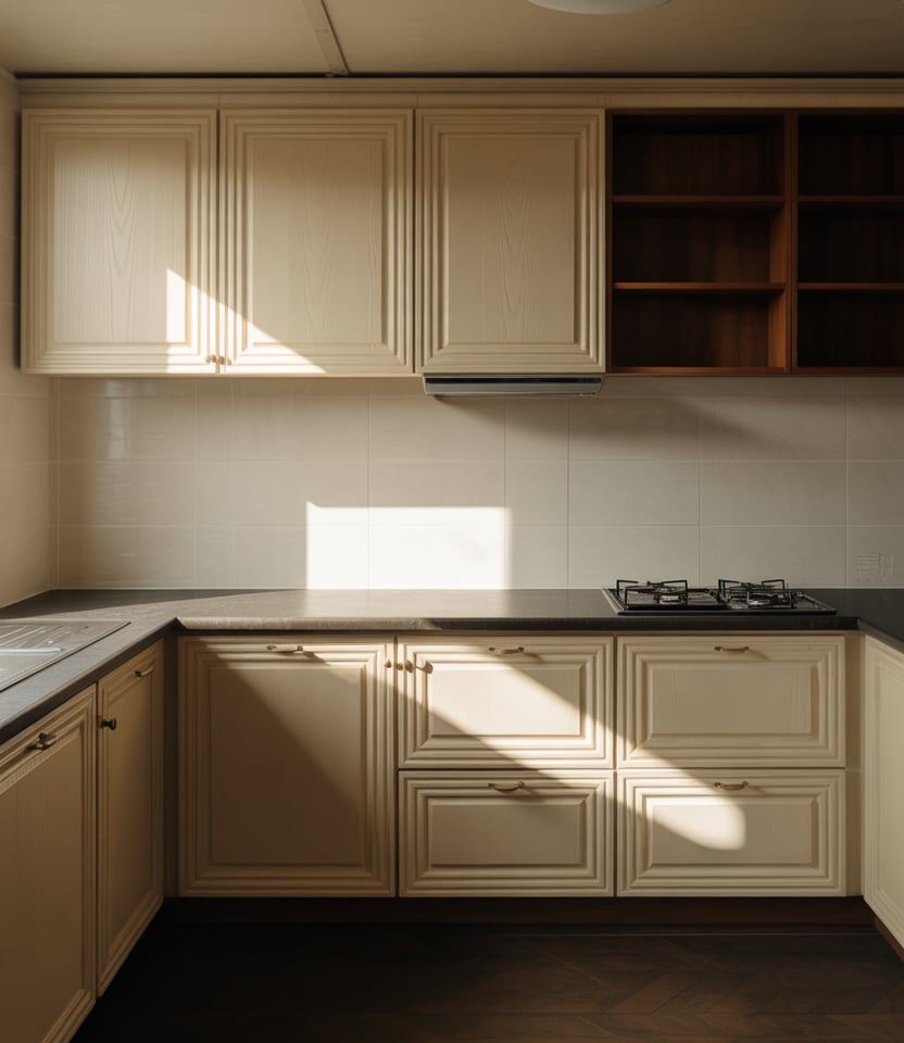 Soft neutral cabinets are stepping into the spotlight in 2026, especially when paired with black granite counters. These colors sit between beige and greige, offering warmth without reading yellow. Against dark stone, the cabinetry feels intentional and grounded, giving kitchens a polished look that still feels relaxed and livable.