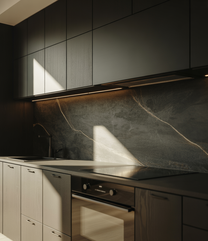 Charcoal cabinetry is stepping forward in 2026, especially when paired with black slab surfaces. The overall Moody effect feels sleek and intentional, not heavy. This look often appeals to homeowners drawn to modern, city-inspired interiors.