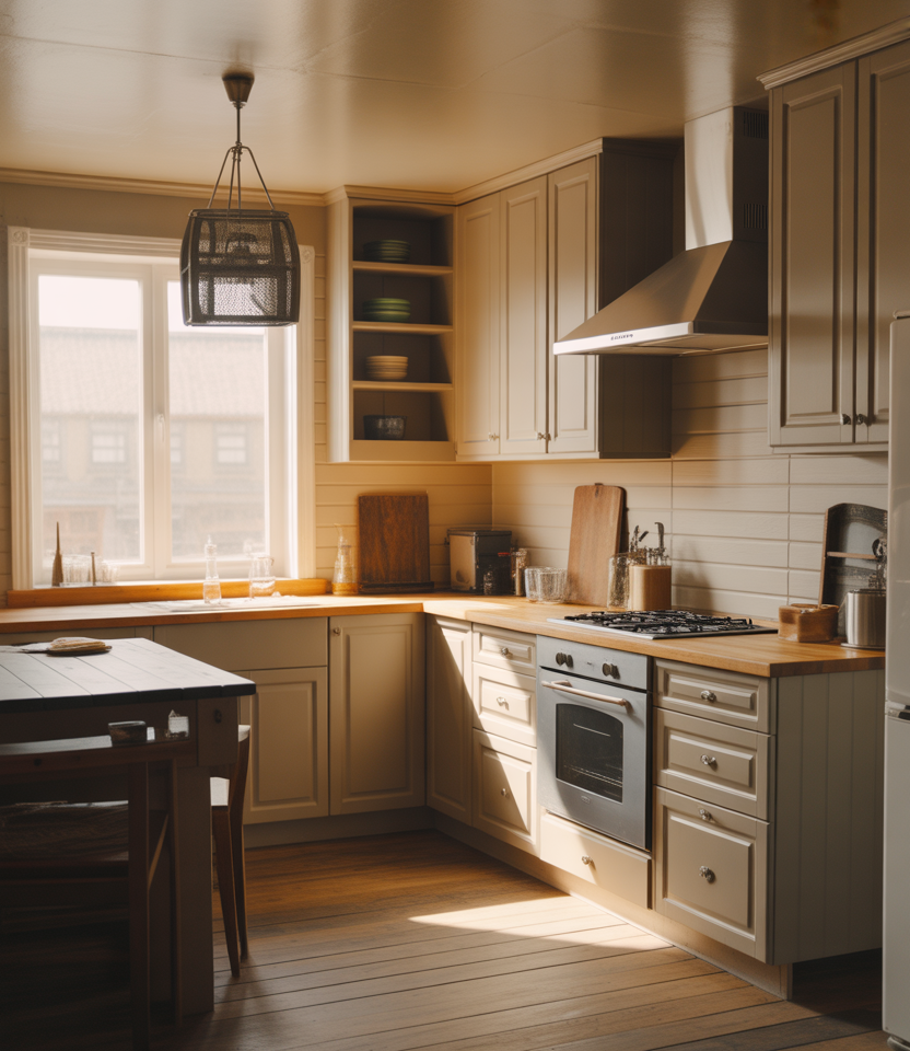Softly painted cabinets alongside butcher block counters continue to appeal to homeowners seeking warmth. In 2026, neutral paint tones allow the wood to take center stage while keeping the kitchen light and approachable.