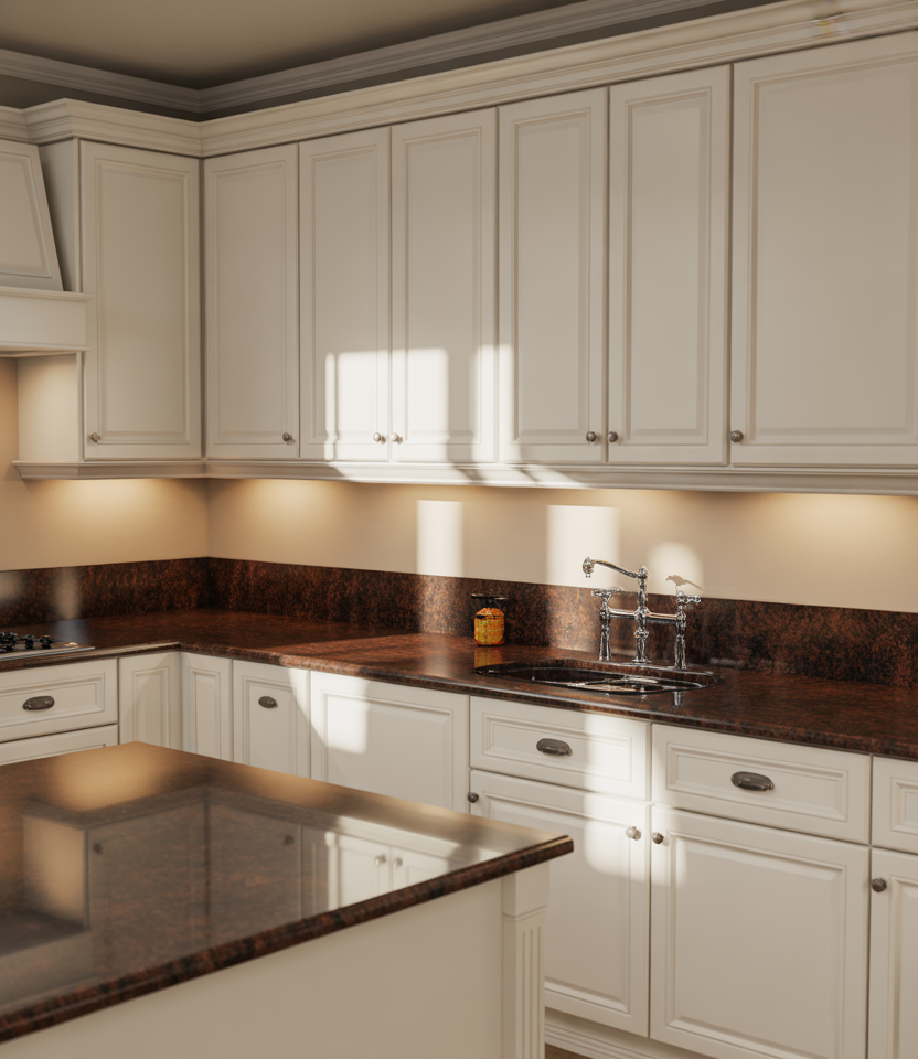 White cabinets aren’t going anywhere, but in 2026 they’re often paired with dark brown granite counters for contrast. This combination feels grounded and timeless, offering visual weight without sacrificing brightness. White cabinetry stays crisp, while the stone adds character.