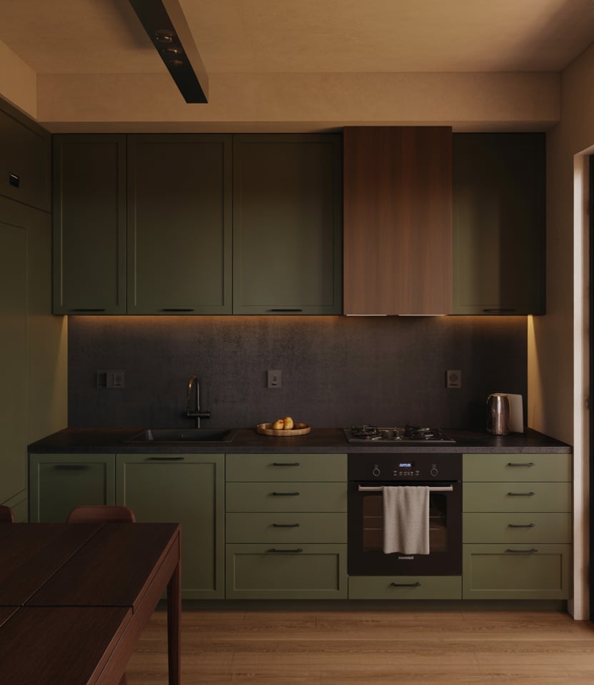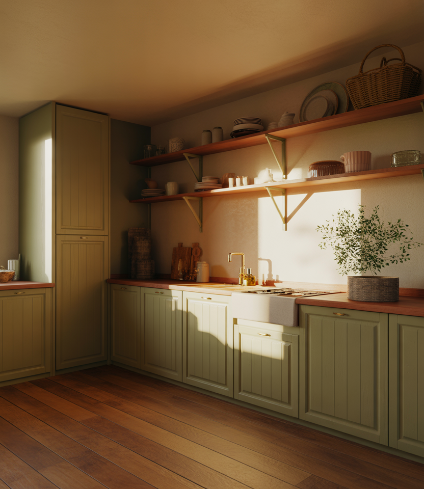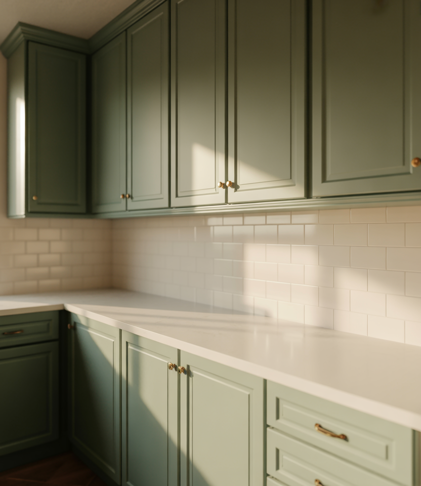 Especially when paired with a warm wood floor, Soft muted Organic GREEN balances the kitchen. 2026 shades are timeless and subdued for a grounded look. Soft sage and olive encourage nature in the space without being overbearing. Green is neutral, as a result.