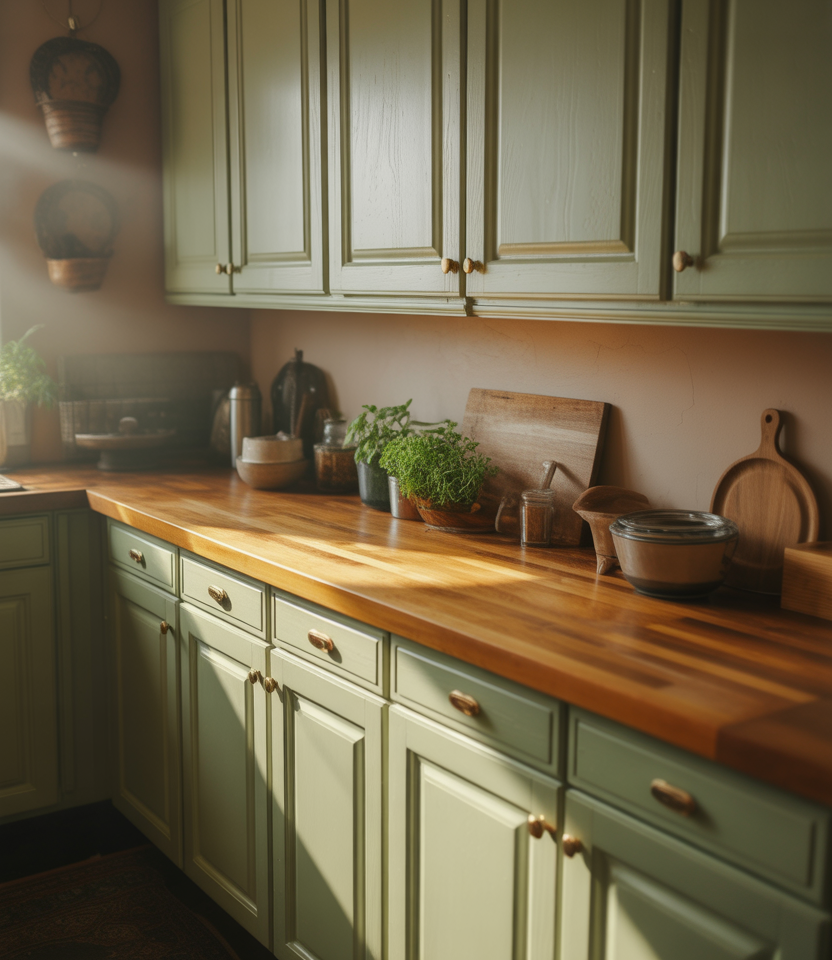 Painted cabinets paired with butcher block counters are having a quiet revival. In 2026, the focus is on subtle tone rather than bold color, letting the wood grain shine. Lightly painted cabinetry offers contrast without overpowering the organic feel of the counters.
