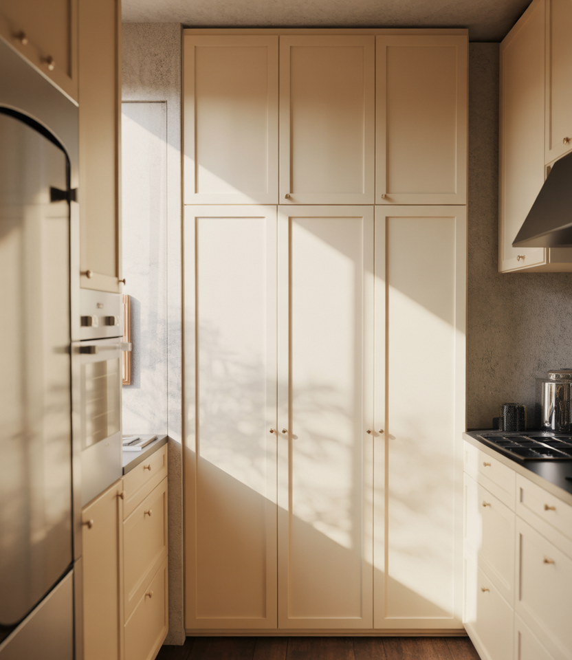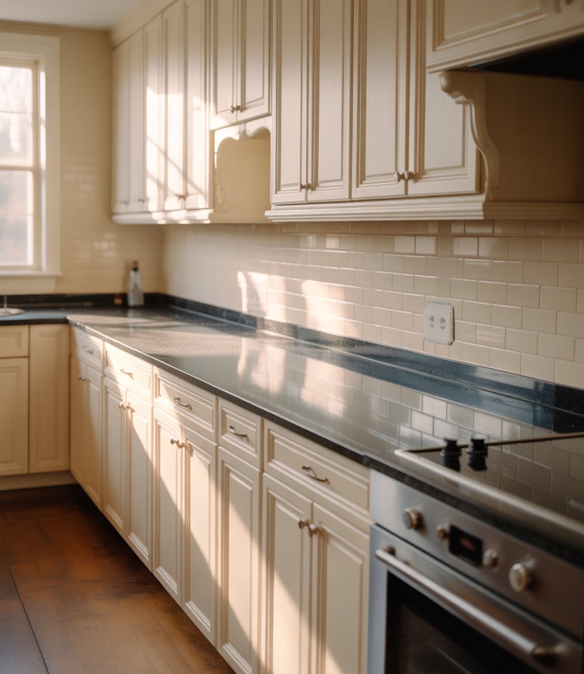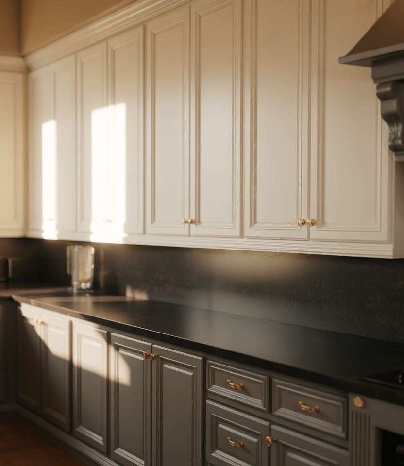 Soft neutral cabinets are stepping into the spotlight in 2026, especially when paired with black granite counters. These colors sit between beige and greige, offering warmth without reading yellow. Against dark stone, the cabinetry feels intentional and grounded, giving kitchens a polished look that still feels relaxed and livable.