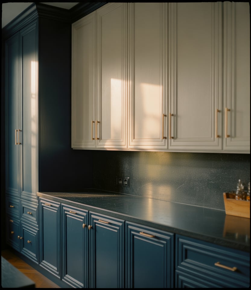 For homeowners ready to commit, blue shows up again in layered, confident ways. A two-tone approach using blue cabinets alongside lighter uppers pairs well with dark granite counters. The result feels tailored and expressive without overwhelming the room.