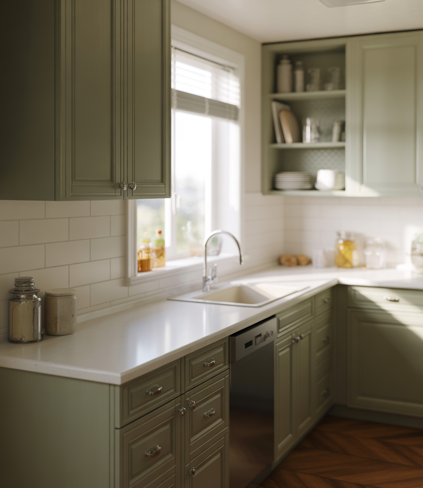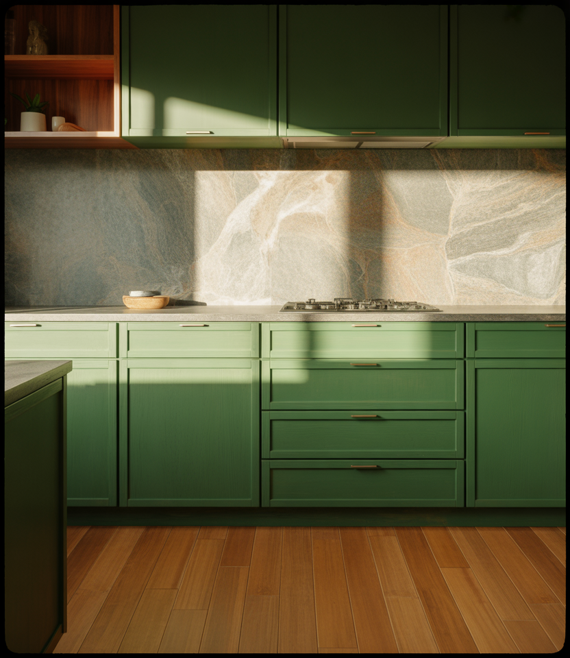 Especially when paired with a warm wood floor, Soft muted Organic GREEN balances the kitchen. 2026 shades are timeless and subdued for a grounded look. Soft sage and olive encourage nature in the space without being overbearing. Green is neutral, as a result.