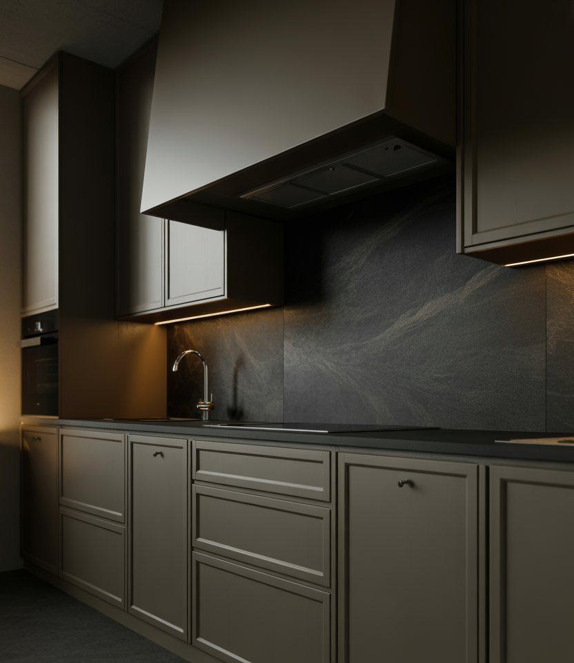 Charcoal cabinetry is stepping forward in 2026, especially when paired with black slab surfaces. The overall Moody effect feels sleek and intentional, not heavy. This look often appeals to homeowners drawn to modern, city-inspired interiors.