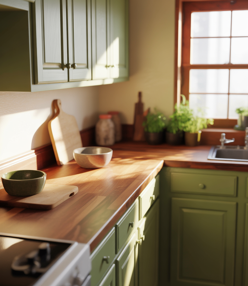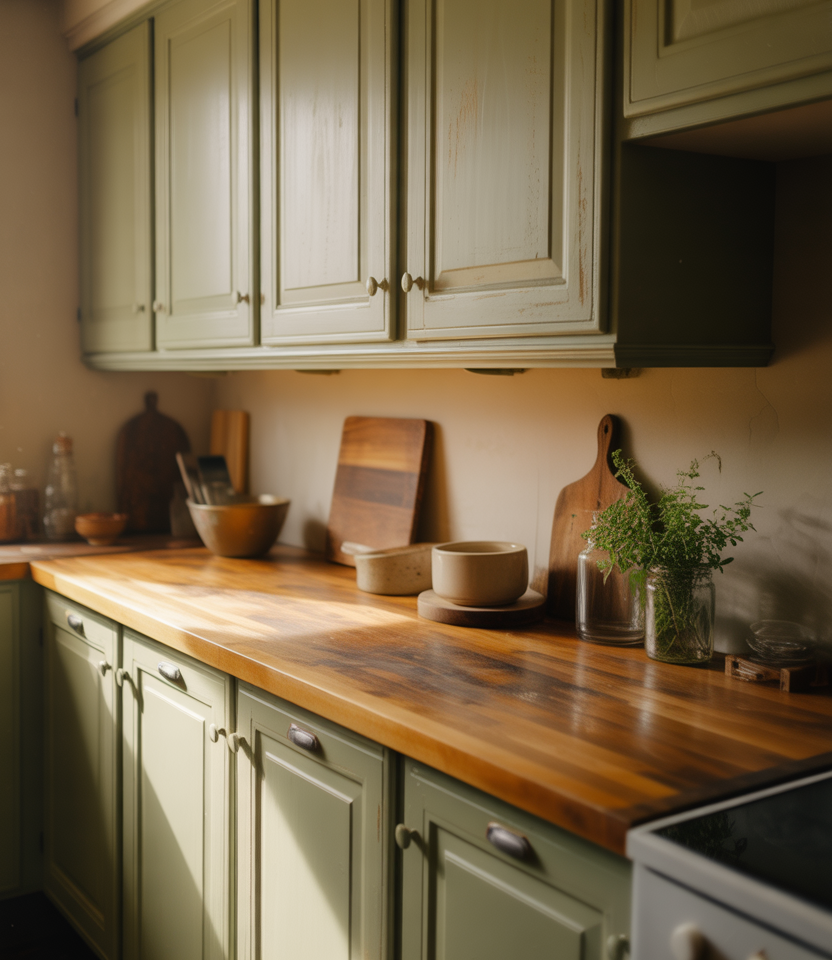 Painted cabinets paired with butcher block counters are having a quiet revival. In 2026, the focus is on subtle tone rather than bold color, letting the wood grain shine. Lightly painted cabinetry offers contrast without overpowering the organic feel of the counters.