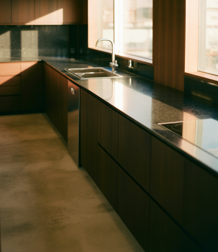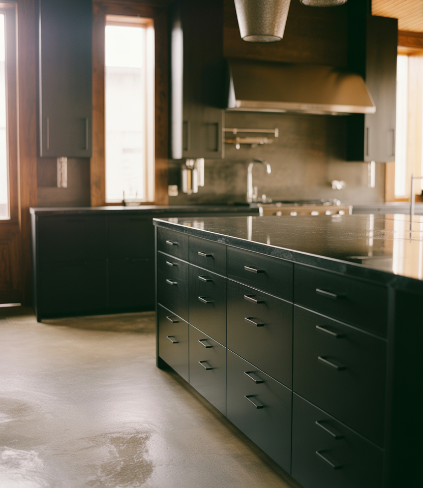 Industrial influences are shaping cabinet choices, especially when dark finishes meet concrete floors. In 2026, pairing deep cabinetry with black granite counters creates a grounded, architectural feel. These kitchens lean modern without feeling cold, even alongside dark countertops.