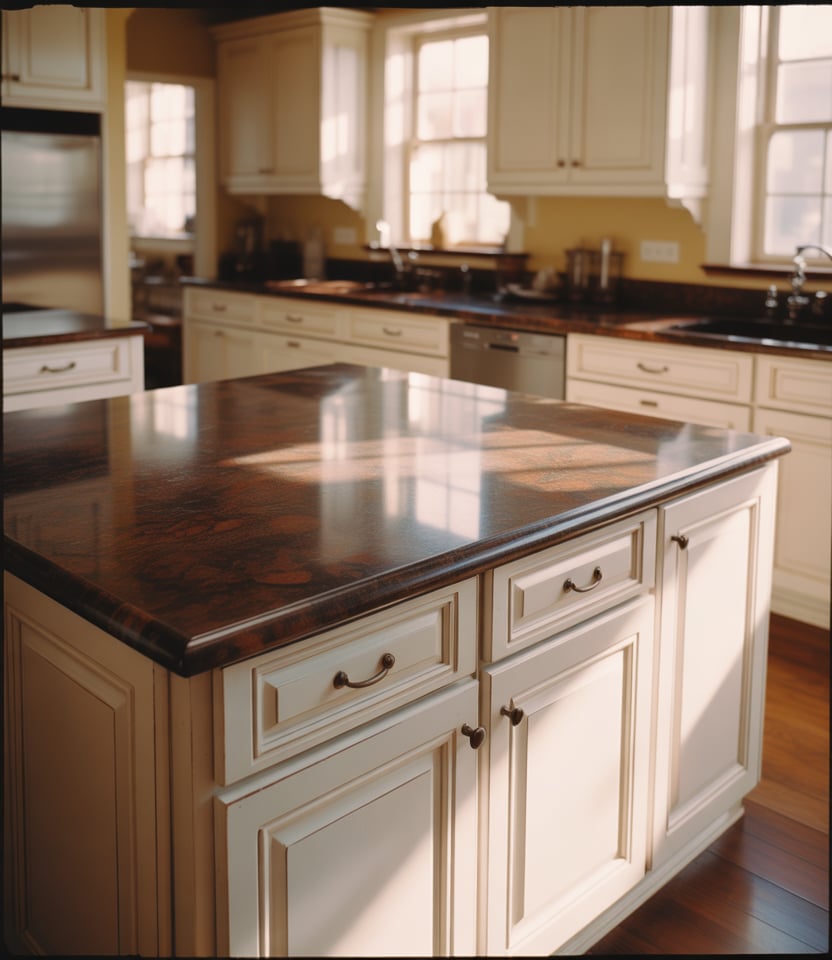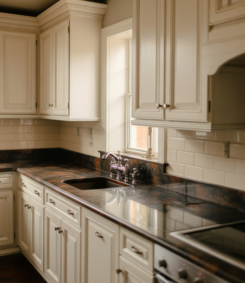 White cabinets aren’t going anywhere, but in 2026 they’re often paired with dark brown granite counters for contrast. This combination feels grounded and timeless, offering visual weight without sacrificing brightness. White cabinetry stays crisp, while the stone adds character.
