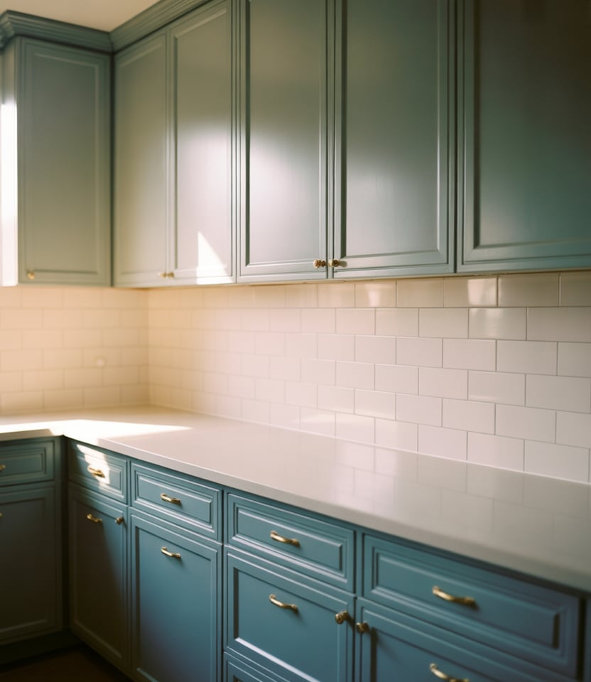 Soft, desaturated blue cabinets continue to appeal in 2026, especially in family kitchens. These shades pair effortlessly with a white countertop and simple finishes, creating a look that feels calm rather than decorative. Blue reads as neutral enough for daily use.