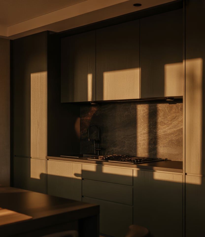 Moody kitchens, especially those featuring a full color block of deep cabinetry, black slab backsplash, or counters, are gaining traction. These dark spaces embrace shadow and depth within the dark counters. In 2026, the look feels intentional” and urban rather than heavy or dramatic.