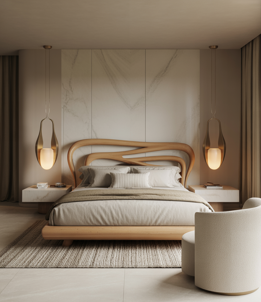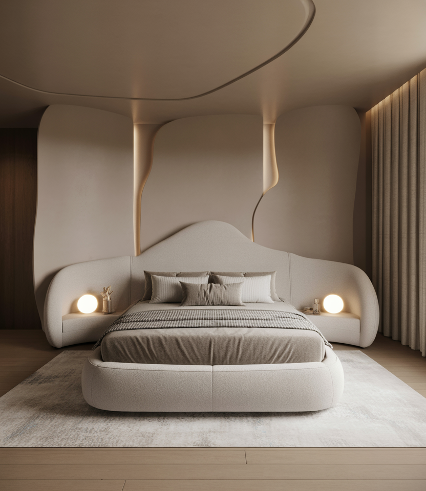 Sculptural modern luxury bedrooms use curved headboards, artistic lamps, and softly contoured furniture to create a fluid, stylish environment. I once saw a designer shape a room around a single arched bedframe—it changed everything. This 2026 idea fits homeowners who want an artistic yet restful space with personality but not clutter.