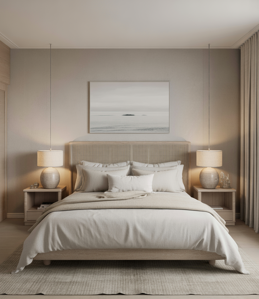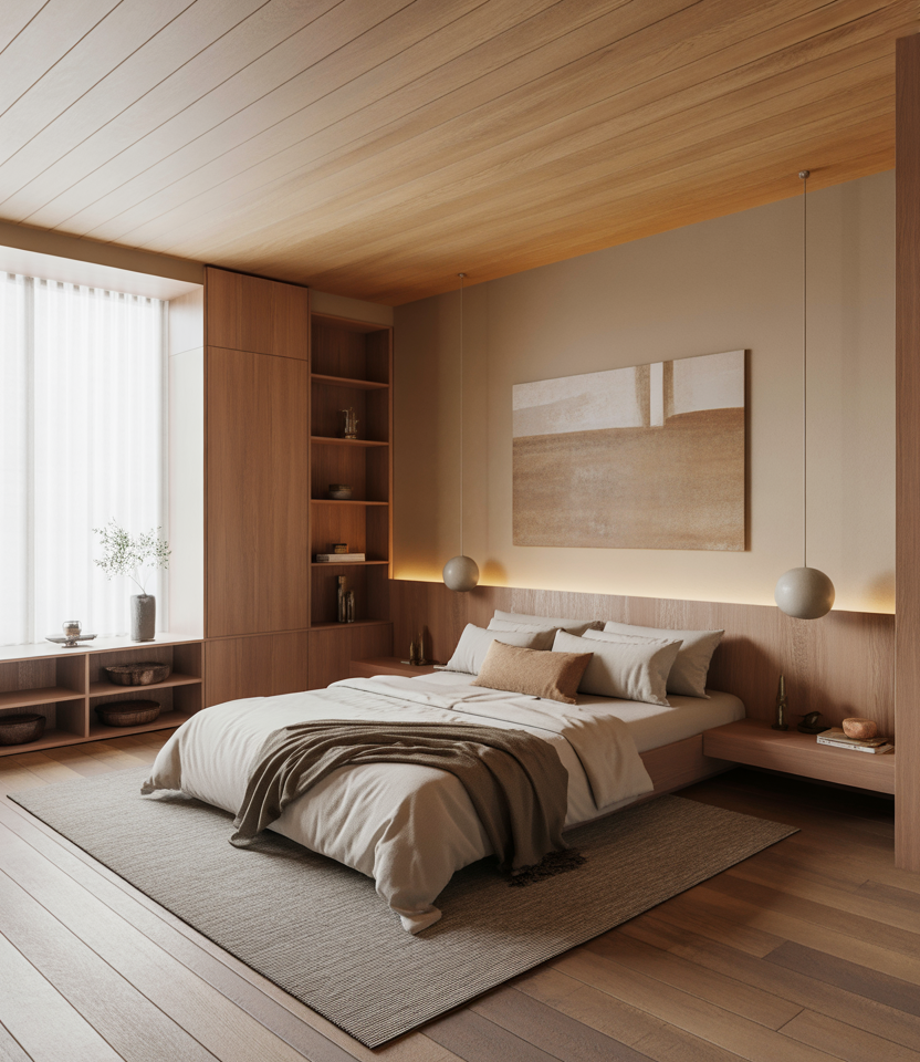 A Japandi bedroom continues to trend into 2026, merging Scandinavian coziness with Japanese restraint. The result is minimal, elegant, and exceptionally contemporary. When I first adopted this style at home, I was shocked how quickly the uncluttered layout improved my sleep. Natural woods, soft earth tones, and balanced proportions make this look ideal for anyone craving serenity.