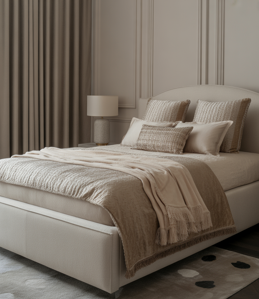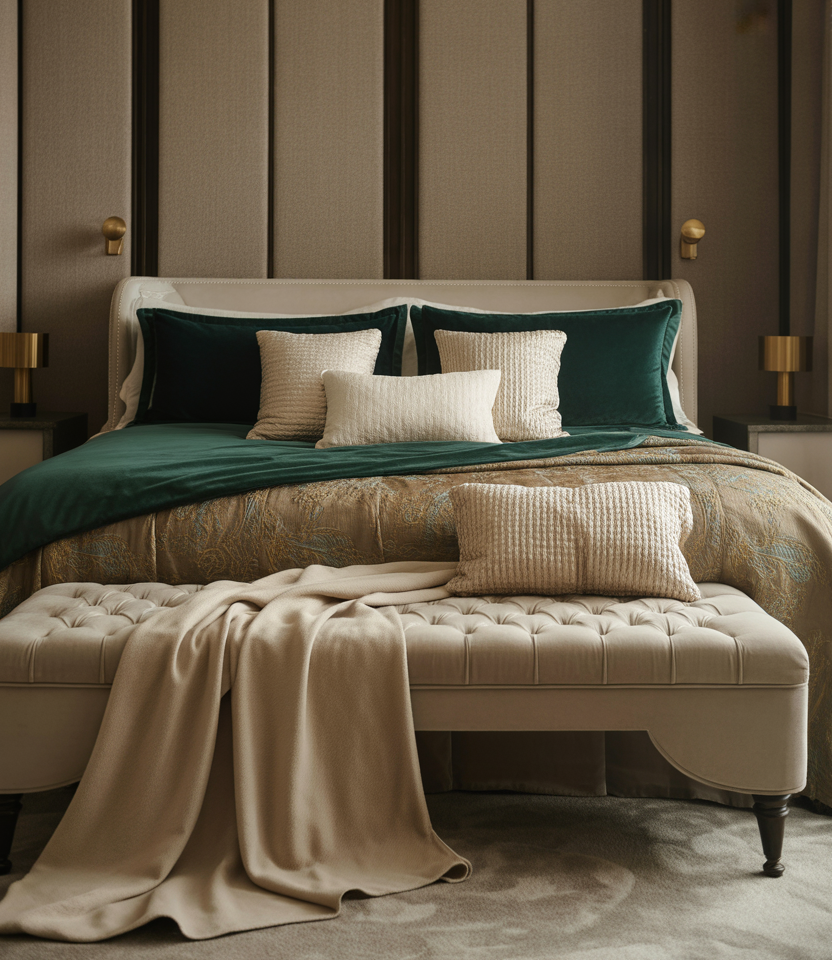 Textured luxury bedrooms focus on rich fabrics—velvet throws, boucle chairs, and embroidered pillows—to create depth without visual noise. This trend resonates for 2026 because tactile comfort feels like a natural retreat after long days. I once added a boucle bench to my space, and it instantly felt high-end. Perfect for those wanting quiet sophistication.