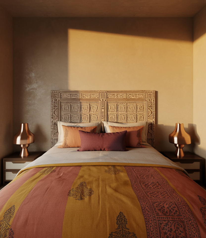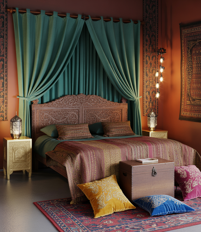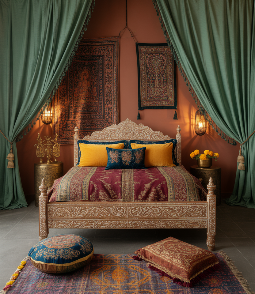 Indian-inspired bedrooms bring handcrafted textiles, carved furniture, and intricate patterns into play. The vibe is vibrant yet elegant, and it’s perfect for those who appreciate cultural depth in décor The first time I bought a block-printed quilt from a Rajasthan artisan market, the bedroom instantly felt warmer and more personal. This style works wonderfully in both small and full-size rooms.