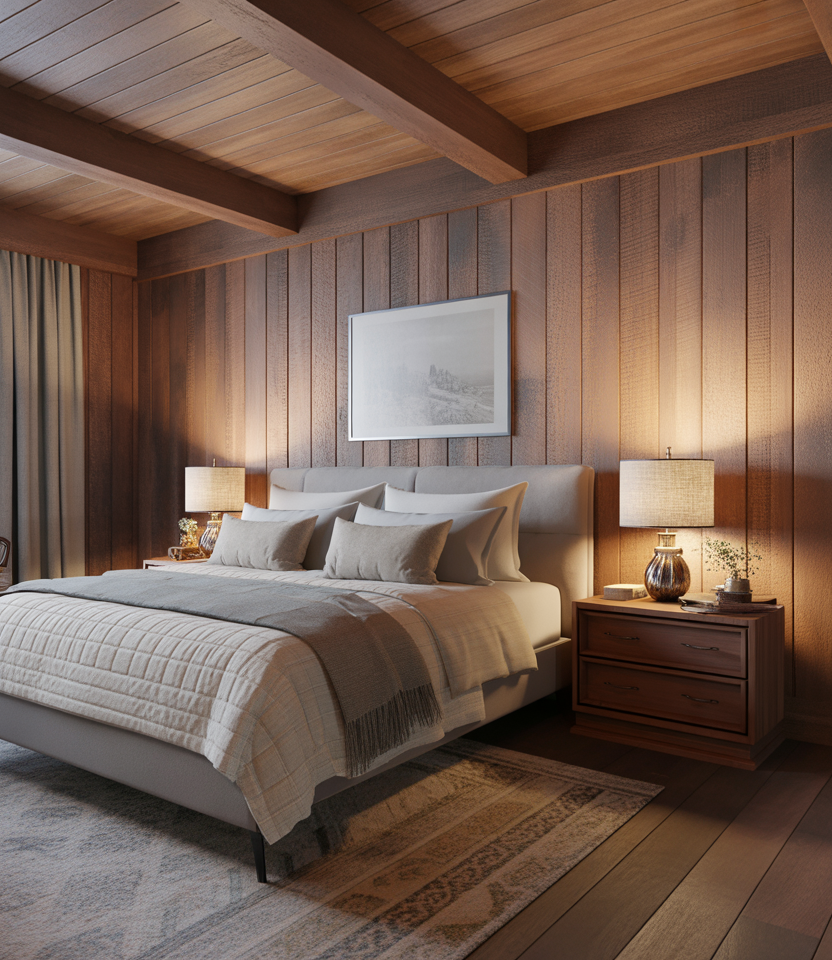 A natural traditional woodscape pairs warm timber paneling with heirloom-style décor for a grounded, classic feel. I remember visiting a Vermont lodge where the bedroom’s wooden walls made winter mornings feel comforting rather than cold. This 2026 idea suits people who want a welcoming retreat rooted in nature and craftsmanship.