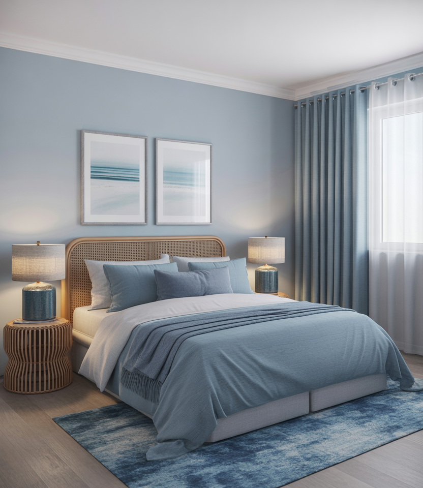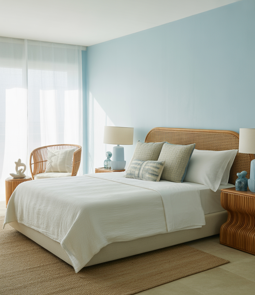 Breezy blue coastal modern design blends oceanic hues with sleek shapes for a contemporary yet relaxed 2026 look. I stayed in a Florida rental where pale blue walls and modern rattan furniture created an instant vacation mood. This idea fits homeowners wanting freshness without leaning too heavily into nautical themes.