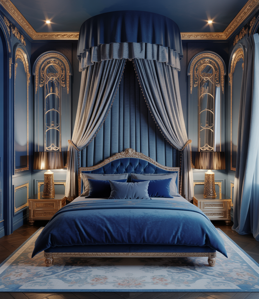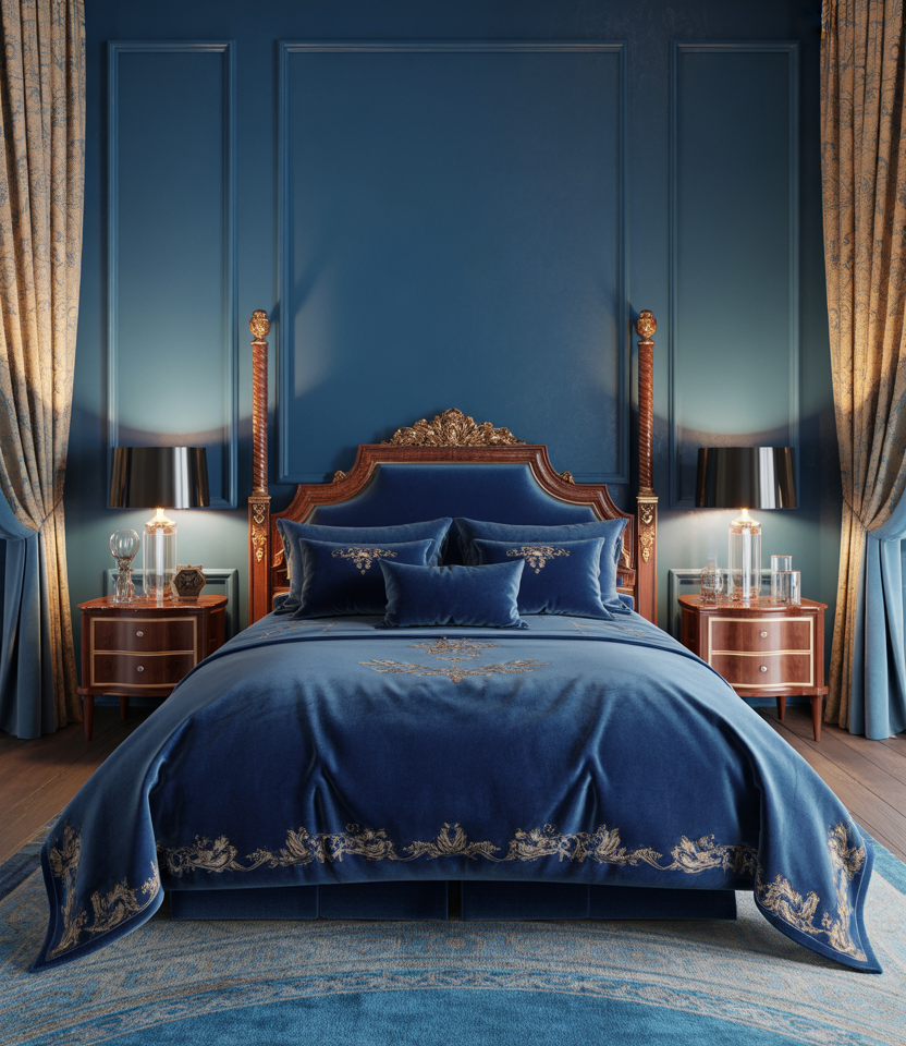 A royal luxury bedroom reimagines historic elegance for 2026 with rich textiles, carved wood, and an elegant sense of symmetry. It feels classic without becoming theatrical. I remember walking through an old Charleston mansion and noticing how the deep blues and gold accents transformed even modest rooms into stately retreats. This style applies beautifully to master bedrooms seeking presence and warmth.