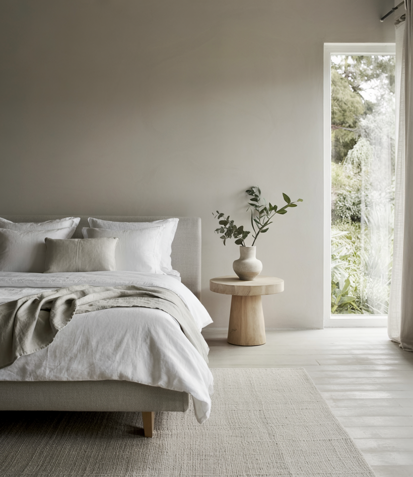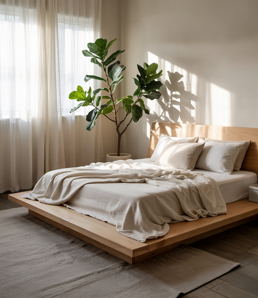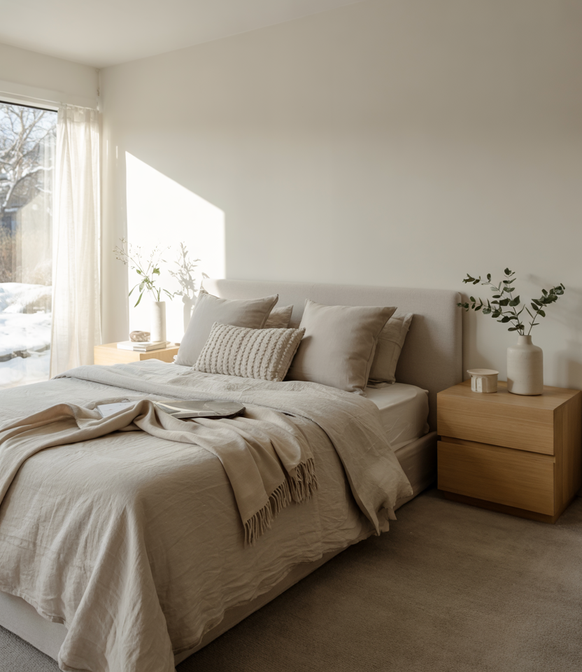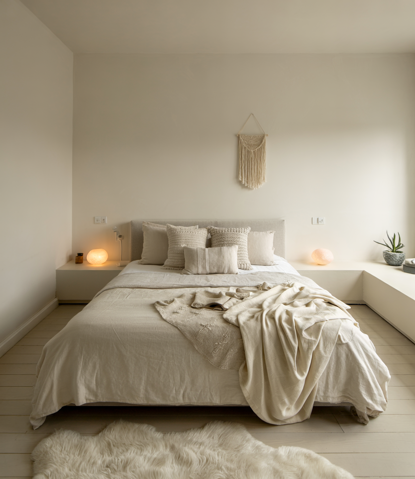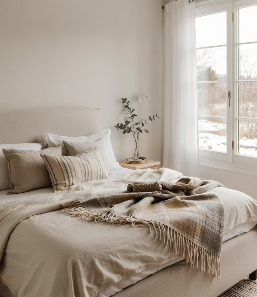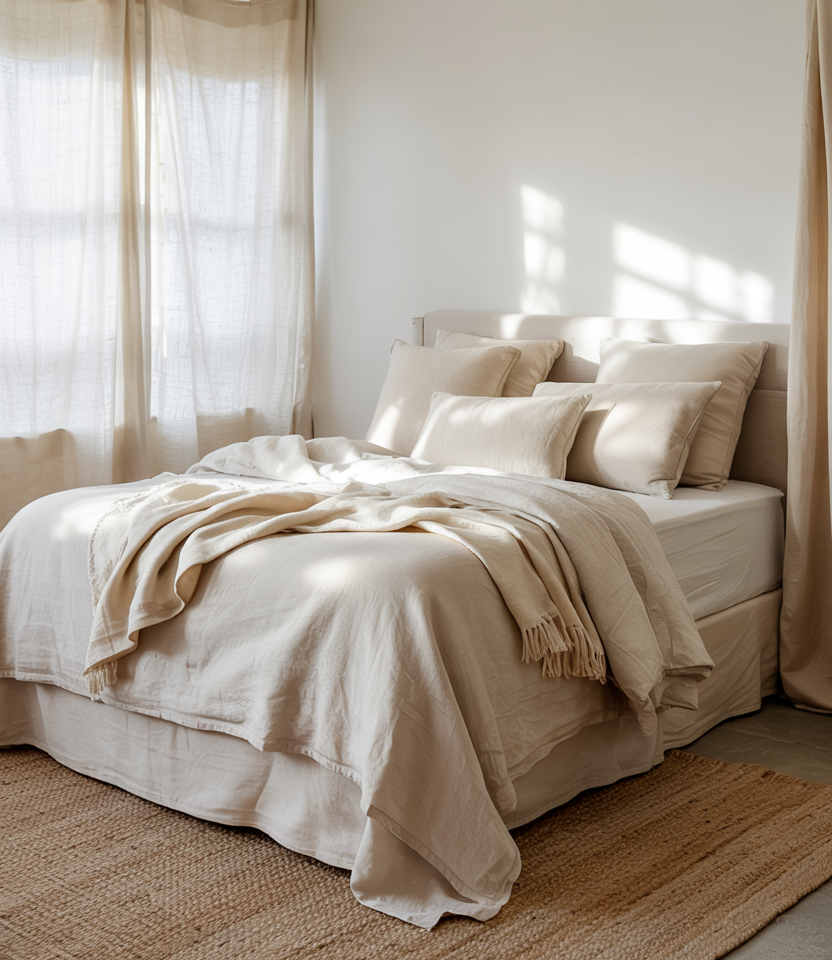 For those who love calm, layered comfort, a linen-focused palette with cream, oat, and soft white fabrics creates a spa-like bedroom atmosphere. Ideal for primary spaces or spare, calming guest suites, this look blends airy curtains, natural jute accents, and buttery-soft bedding. Visiting a friend’s California home, I noticed how linen quietly elevates a room—effortless, breathable, and incredibly inviting.