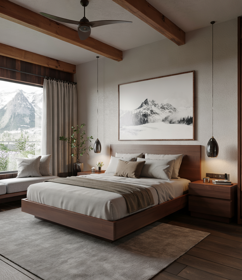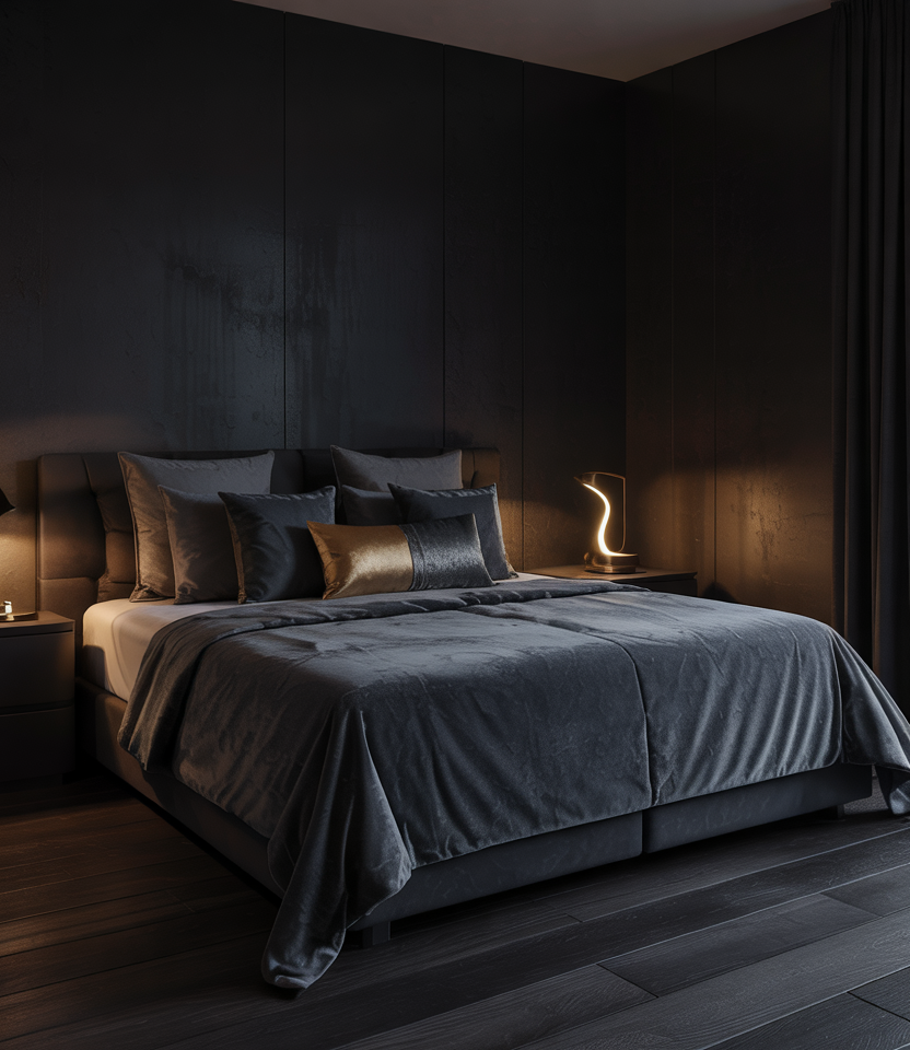 Modern cabins inspired this look—matte black wood walls, warm brown walnut furniture, and soft lighting create cabin-meets-city elegance. Ideal for those who love modern minimalism but crave warmth. On a ski trip I saw this style in a lodge suite; sleek yet earthy, it felt like nature refined.