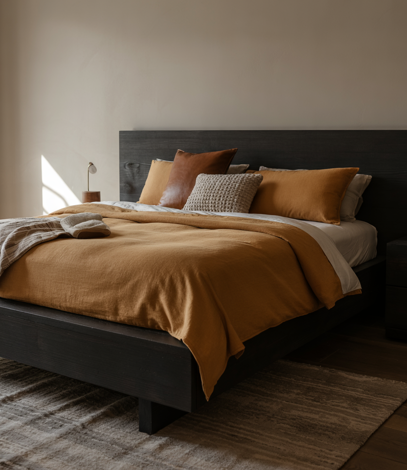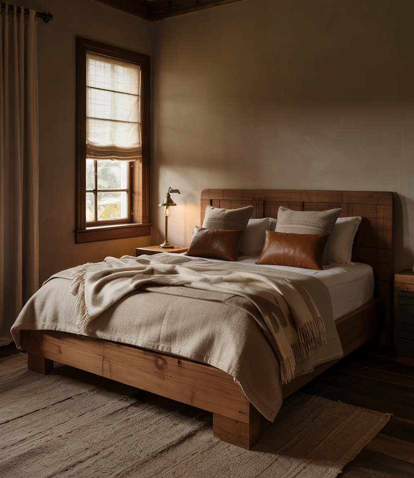 A Western-inspired palette of brown, leather, woven textiles, and iron accents creates earth-rooted comfort. Great for cabins, ranch-style houses, or anyone craving cozy countryside vibes. I once road-tripped through Montana, where lodge bedrooms had woven wool blankets and warm timber—simple, rugged, yet undeniably comforting.