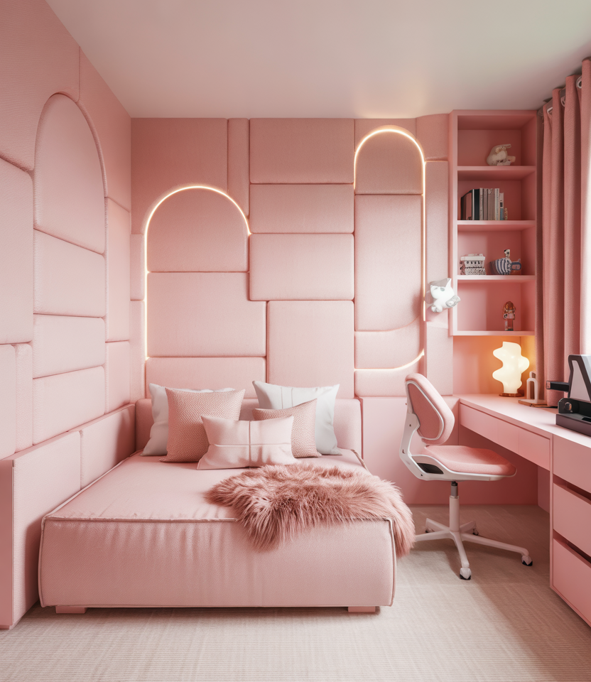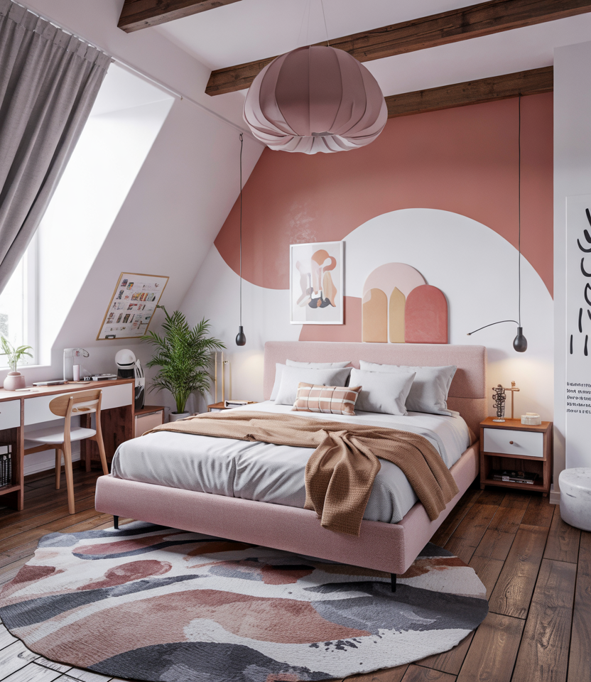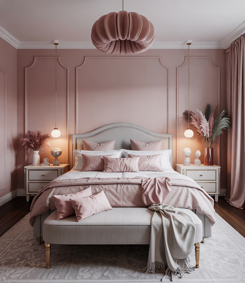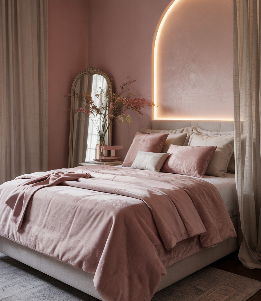 A bold, mature twist on pink—think velvet, gold accents, and sculptural lighting. It suits fashion-lover dressing rooms or glamorous primary spaces. A friend’s glam bedroom with rose-gold details and a plush bed feels like stepping into a chic boutique—confident, fun, and wonderfully indulgent.