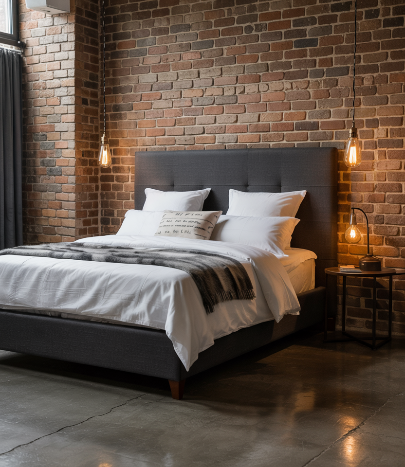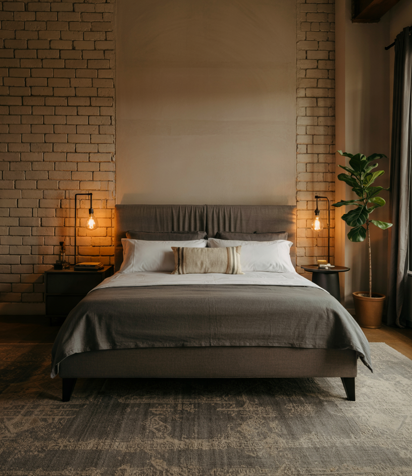 Industrial design evolves in 2026 with oil-rubbed bronze accents, textured black fixtures, and warm bulbs softening the factory-loft feel. This style suits open-plan apartments, finished basement suites, or urban primary bedrooms that crave an edge. I once stayed in a Denver loft with industrial hardware and plush bedding—the contrast felt sophisticated instead of stark.