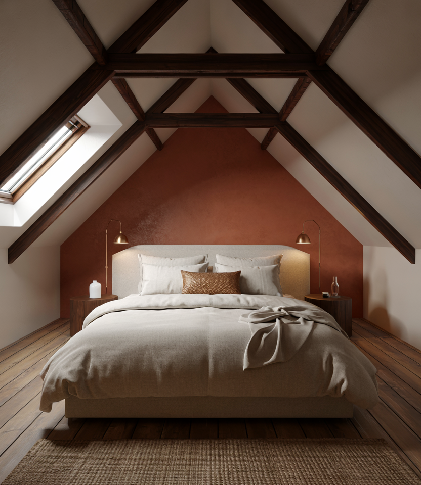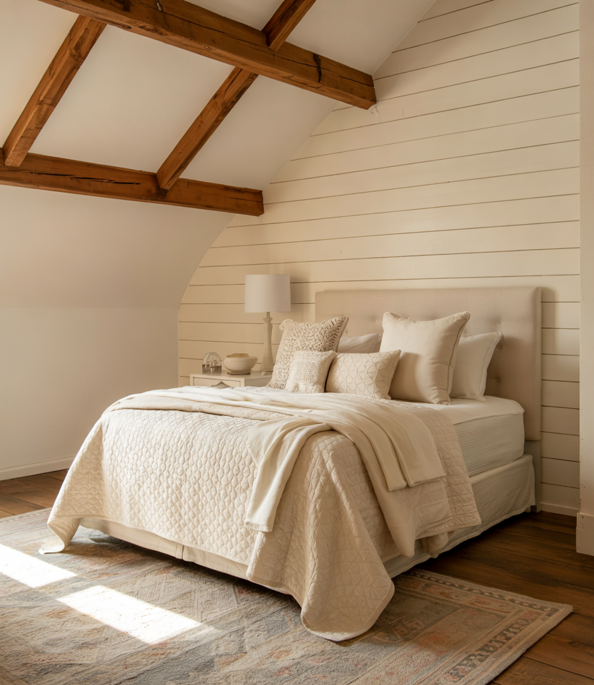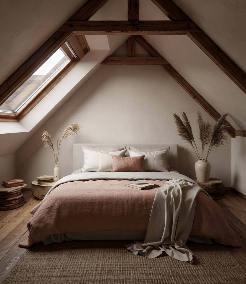 Turn an attic into a moody retreat with sloped-ceiling charm, rustic beams, and soft organic textures. It’s perfect for A neighbor recently transformed their attic, and stepping inside felt like entering a mountain Airbnb—unexpected magic above the roofline.