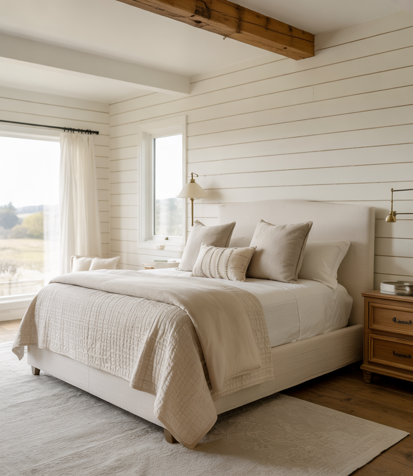 A modern farmhouse look with white shiplap, warm wood beams, quilted bedding, and soft cozy throws brings nostalgic comfort into modern homes. Created for guest rooms or family-friendly primary bedrooms, this style mixes warmth and charm. A farmhouse-style Airbnb I visited in Tennessee was so welcoming, I would rather not leave—simple, textured, and genuinely homey.