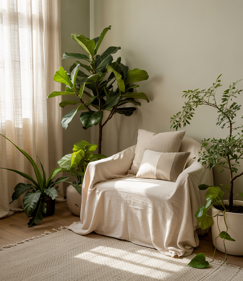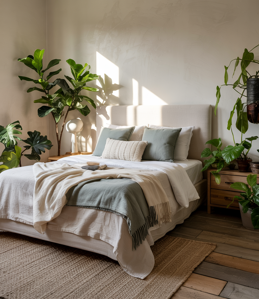 Biophilic design shines in 2026, especially in green-focused rooms full of plants, sage textiles, and natural materials. Ideal for stress relief and morning refresh rituals. Waking up surrounded by greenery reminds me of visiting a rainforest lodge—peaceful, natural, and energizing. It’s achievable even in small rooms with vertical plant shelves.