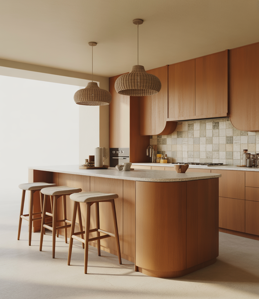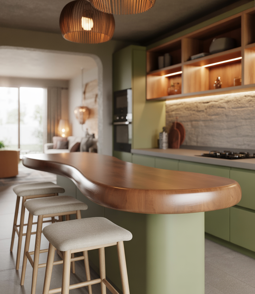 A curved island invites conversation and maximizes seating, especially paired with cozy bar stools. This soft-edged look feels unique and friendly—think relaxed wine nights while someone preps snacks at the sink. In open floor plans, curves help flow without harsh angles. If your home leans Scandinavian or organic modern, curved cabinetry and rounded ends can quietly elevate the space. Designers say curves bring “approachable luxury”—and honestly, they’re right; after testing one in a friend’s home, everyone naturally gathered around without crowding corners.