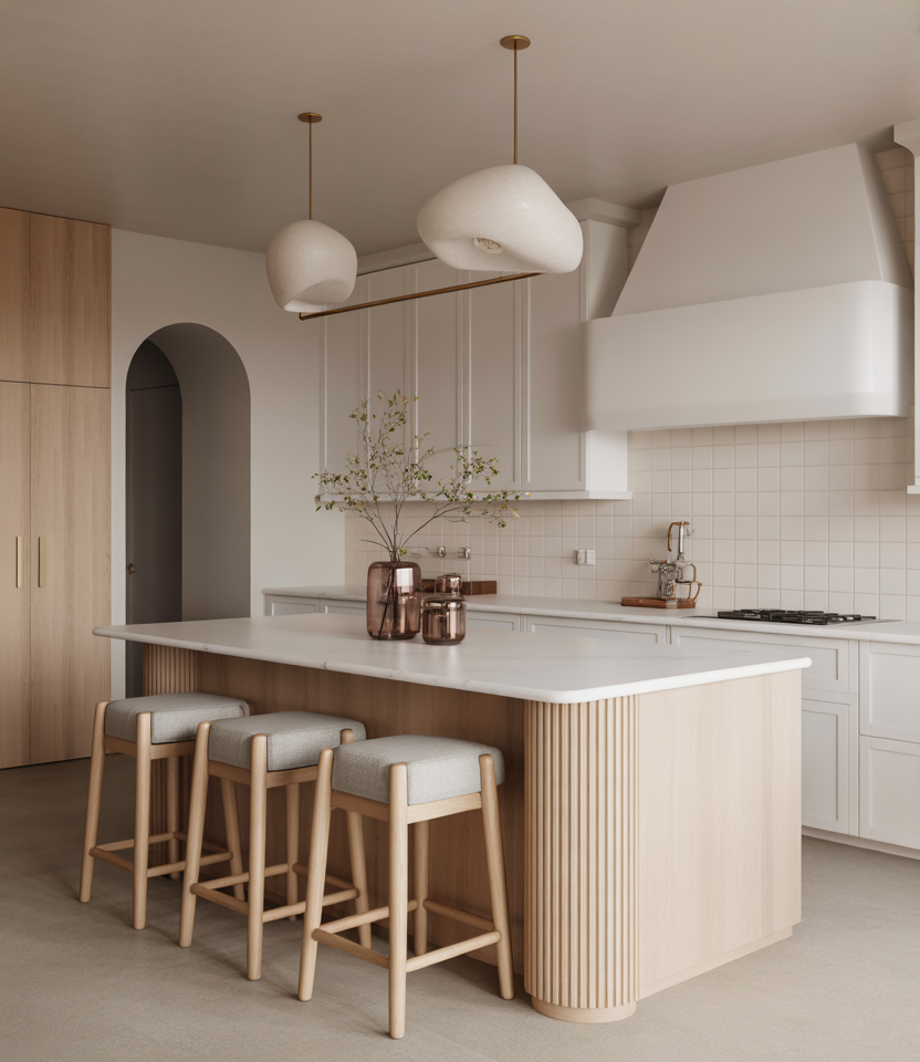 White oak remains the darling of 2026—natural, warm, and endlessly versatile. A white countertop keeps it clean-lined, while fluted details or slim columns add architectural interest. This look suits modern, Japandi, and California-casual homes. I recently toured a model home featuring white oak everywhere—it felt like stepping into a spa retreat. Add subtle brass and soft fabric bar stools to complete a balanced, serene space.