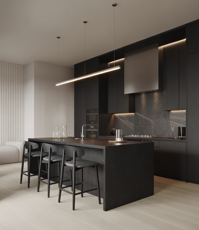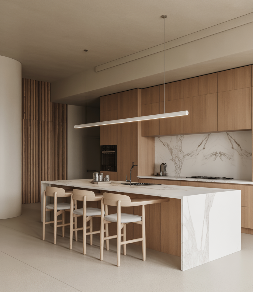A sleek waterfall island brings sculptural drama while keeping the look clean, pairing perfectly with white or black kitchens and warm wood tones like white oak. This style feels unique in both small spaces and large homes because the continuous slab visually expands the room. Add slim seating and hidden storage to keep things clutter-free, and pair with simple bar stools for a gallery-level vibe you see in high-end Los Angeles builds.
