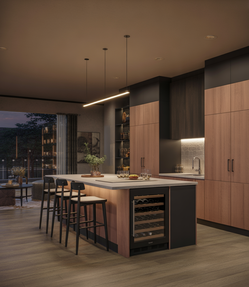 A beverage-focused island with wine fridge, stemware racks, and under-counter ice drawers feels incredibly This works beautifully in open floor plans and large suburban homes where gatherings revolve around mixing drinks and sharing small plates. Choose white oak cabinetry and matte black pulls for a sophisticated look, and add plush bar stools for tasting nights—like a personal Napa lounge at home.