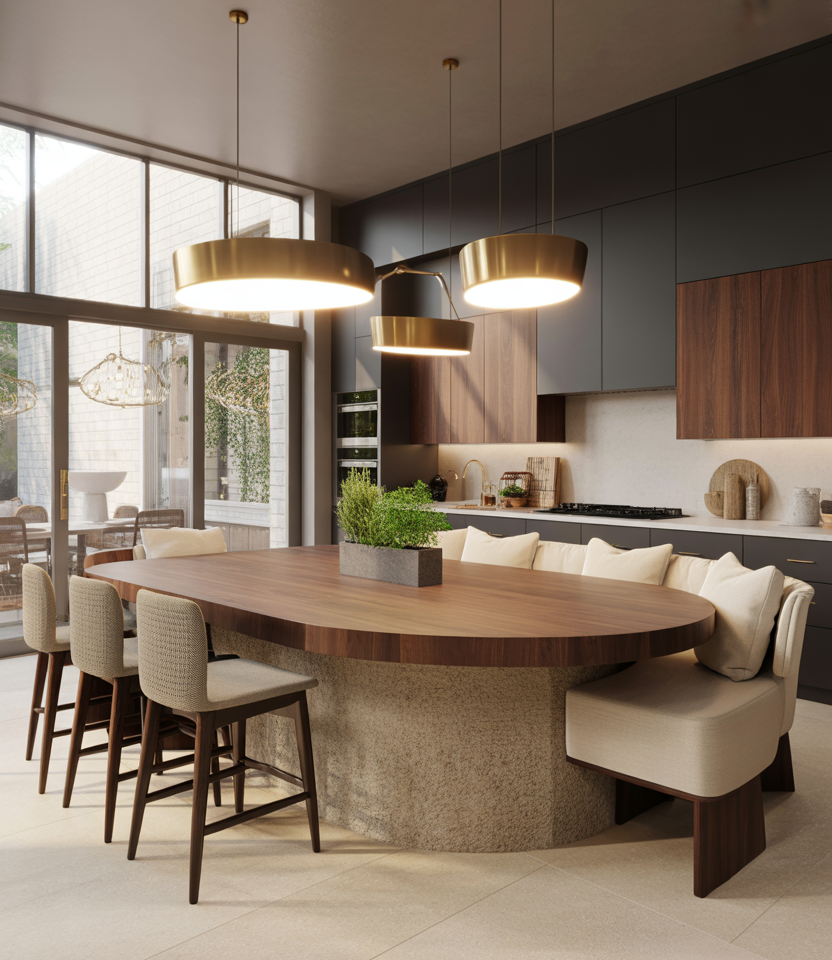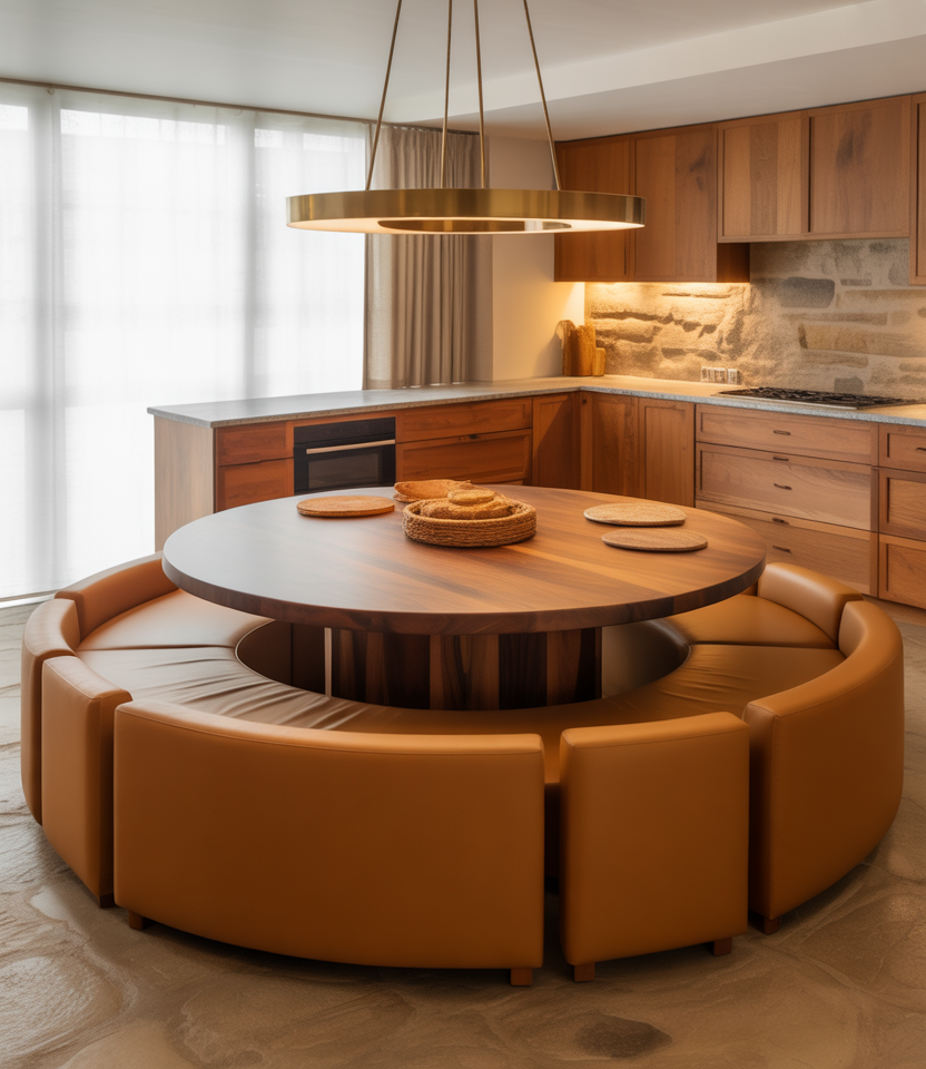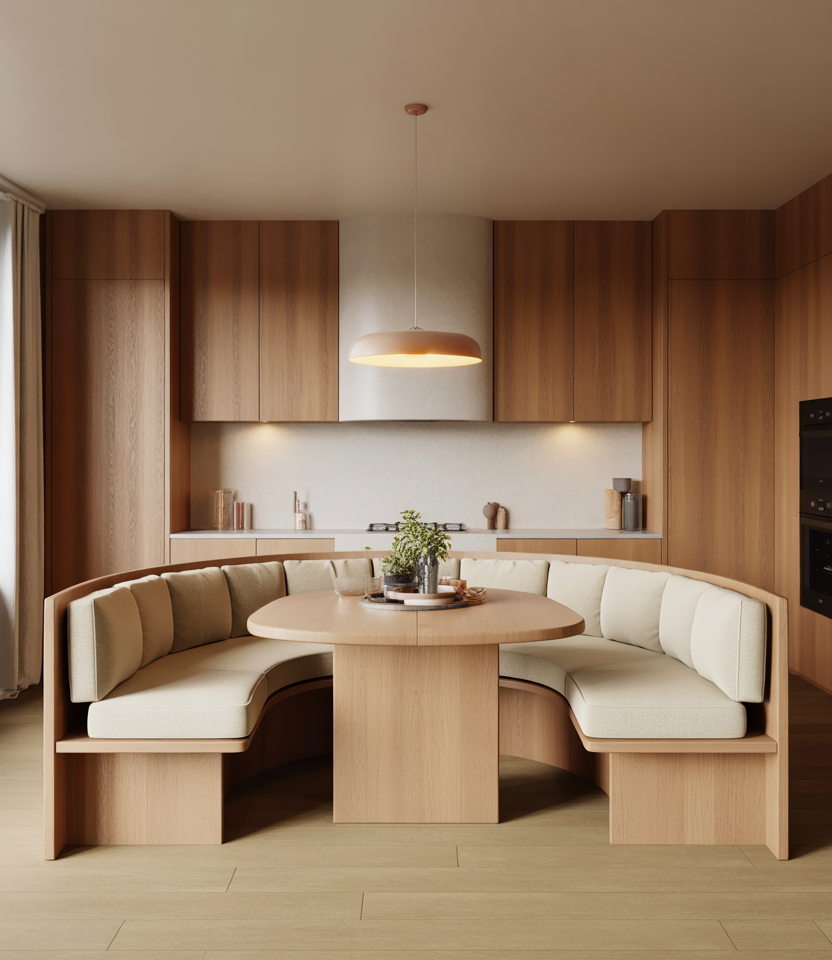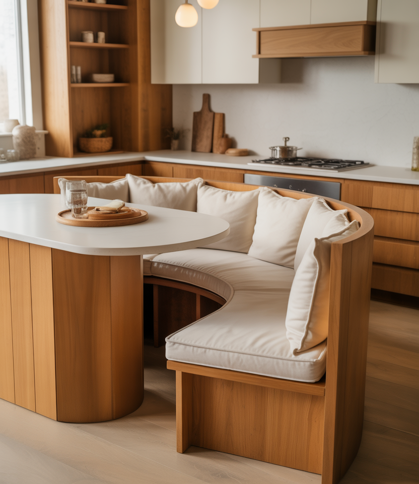 Pairing an island with a built-in banquette creates seating magic—especially in small-space kitchens where every inch matters. The curved or round bench line makes family breakfast feel cozy, and you can choose white oak or rustic wood for warmth. In my cousin’s condo, this setup replaced a dining table and still feels intimate for late-night takeout and card games.