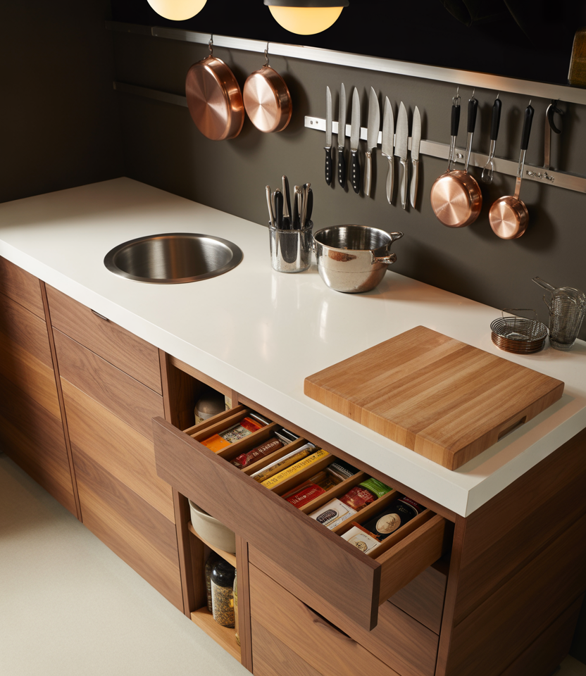 Home cooks love islands packed with utility: integrated chopping blocks, a prep sink, spice drawers, towel bars, and stove adjacency. Think restaurant efficiency but stylish—often seen in chef-inspired homes on cooking shows. This can fit narrow galley layouts or gourmet Large kitchens and brushed metal accents pop against black or white cabinetry.