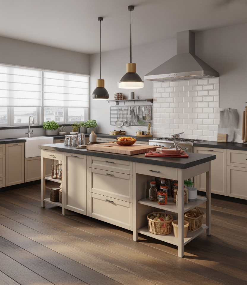 For small-space kitchens, a narrow island doubles storage and prep without crowding. Choose a white or white oak finish to keep things airy. I once helped a friend in Chicago pick a shallow island with hidden bins—it turned a cramped galley into a functional chef zone. Shelves for baskets and hooks for towels make it feel tailored, not squeezed. Add slim seating on one side, and you get a breakfast spot that meets a homework zone that meets an emergency cocktail counter.