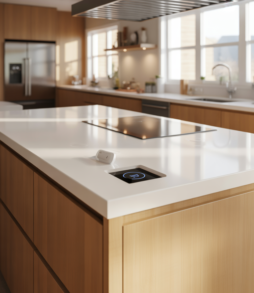 For the modern household, a tech island with hidden outlets, wireless chargers, and tablet stands is life-changing. Ideal for tiny kitchens in apartments or large family homes with constant devices, this idea keeps the surface open and tidy. Combine white quartz with wood accents for warmth, and place slim seating for laptop use and after-school homework.