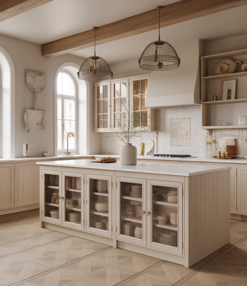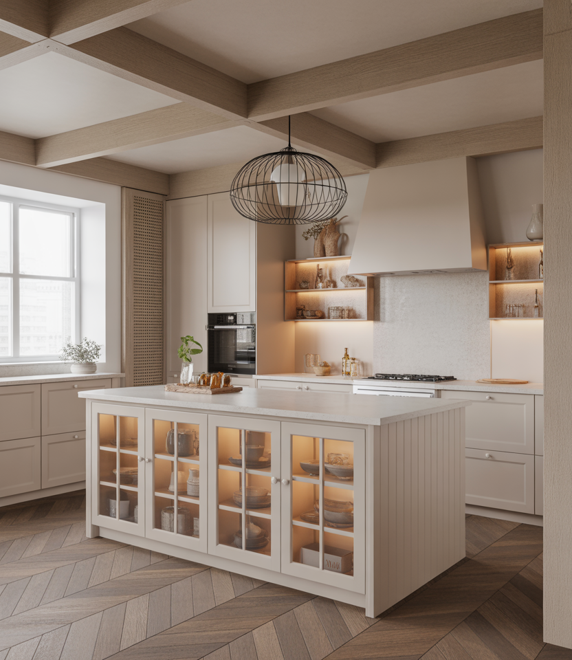 A glass-front island turns serveware into decor and brings airy glamour to white or black kitchen palettes. Perfect for showcasing antique dishes, baskets, or unique pottery collections—especially in large or open kitchens where the island becomes a focal point. Interior lighting adds museum vibes, while white oak frames keep it grounded and organic.