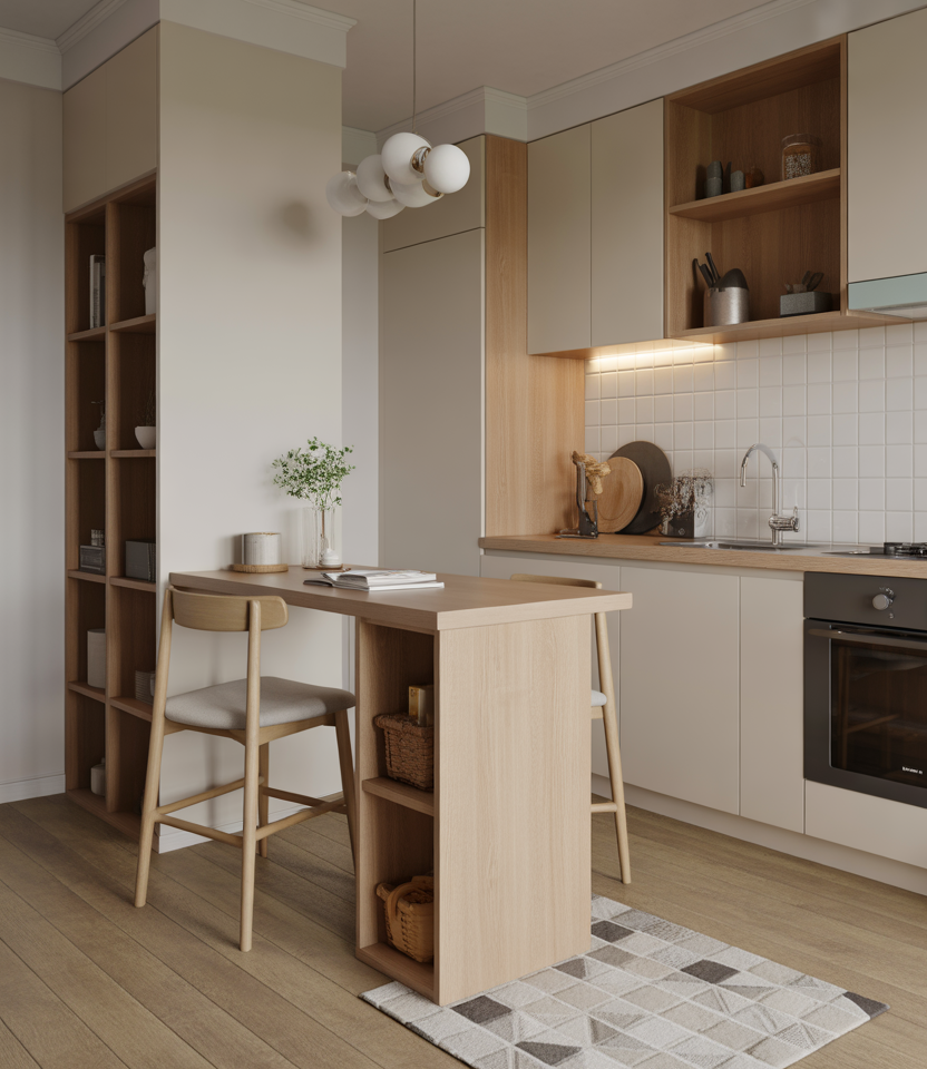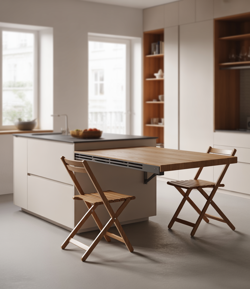A pull-out or fold-down table attached to the island solves space challenges in small-space living. You can host dinner, then tuck the table away—brilliant for tiny condos or narrow kitchens. My college friend had this setup in Boston, which included easy DIY hinges and a wood slab, and it transformed the space. Pair it with stacking bar stools for flexible seating.