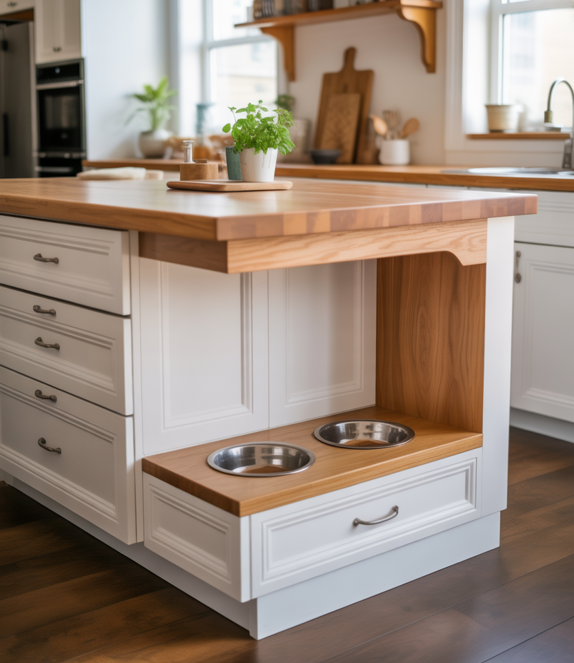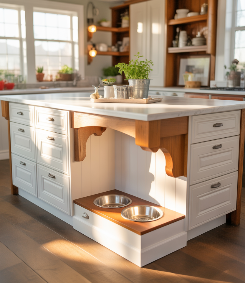 Pet parents love this: a small island extension with bowls, food storage, and a water filter near the sink. Works in large suburban layouts or small-space homes with furry roommates. Choose rustic wood or modern white finishes to match cabinetry. My neighbor’s golden retriever practically wags just seeing the drawer open—pure joy.