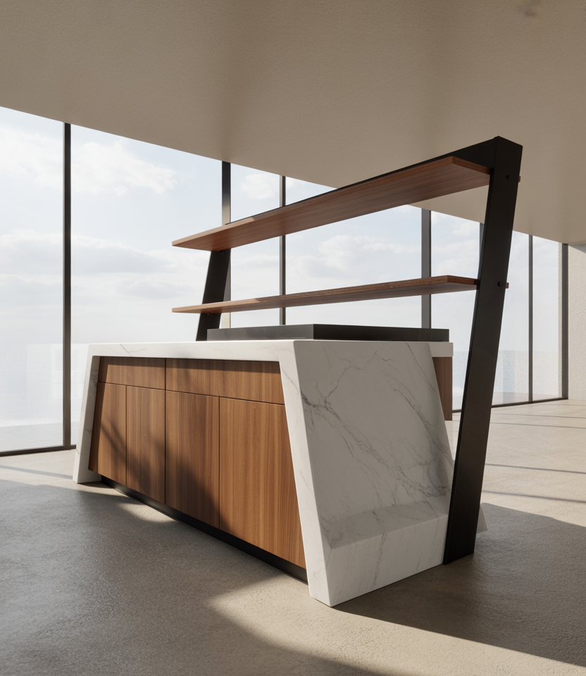 Blending stone, metal, and wood creates a sculptural, unique island. Think white oak paired with veined marble and a black steel support—architectural but homey. Designers call this “material storytelling,” and it shines in open spaces. Great for homeowners who want personality without clutter, balancing warmth with a modern edge.