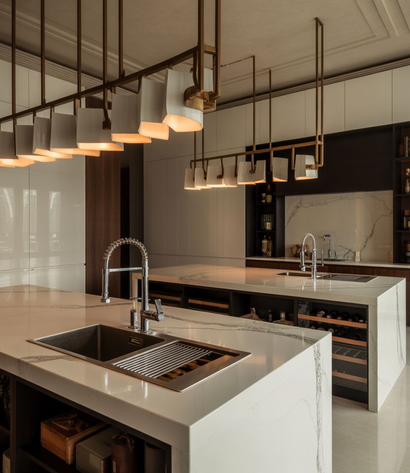 A double-island setup screams entertaining—and efficiency. One island can hide the stove or sink, while the second remains a clean surface for plating and gathering. It’s ideal for large kitchens where hosting is frequent and workflow matters. I once cooked Thanksgiving dinner in a kitchen like this—prep on one side, cocktails and laughs on the other. Even if you’re not throwing weekly dinner parties, a dual setup can separate tasks and keep counters clear, a dream for families with multiple cooks or an at-home baker who treats weekends like a Food Network audition.