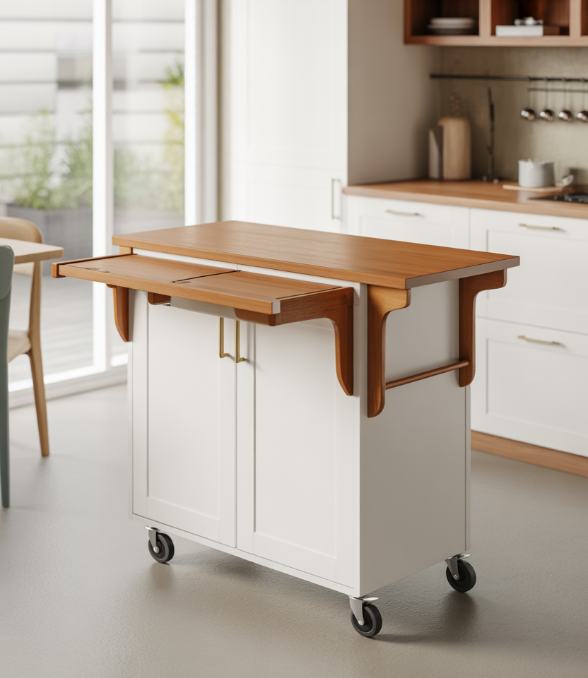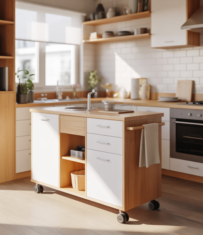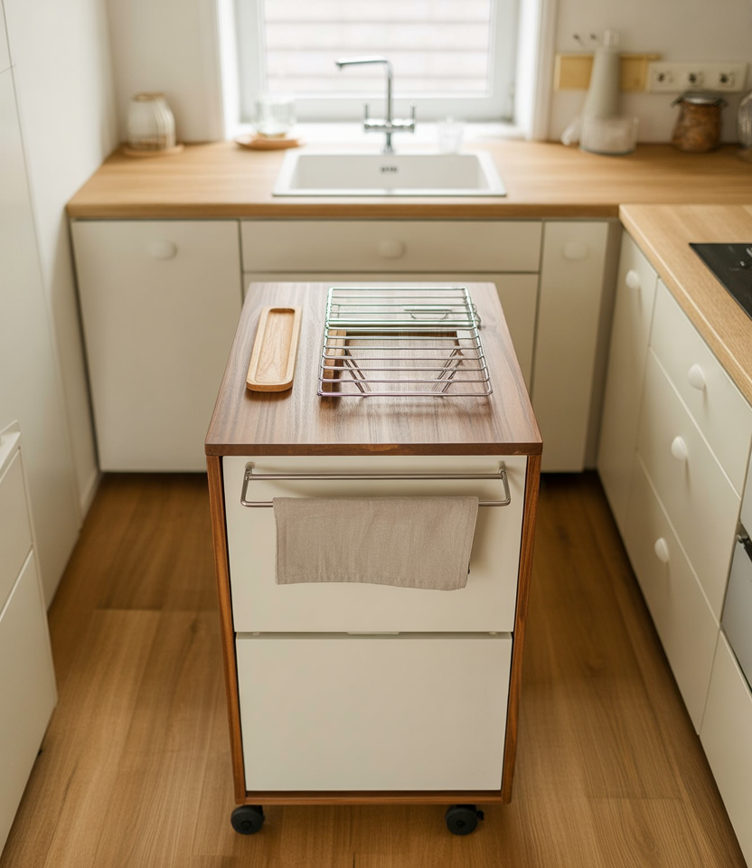 A stylish portable cart-style island with folding leaves and locking wheels works for tiny or small space kitchens. The cart can be rolled outdoors for brunches or used as a serving station between open living areas. Ikea hacks and easy DIY builds make this project a budget win, and wood tops bring natural warmth.