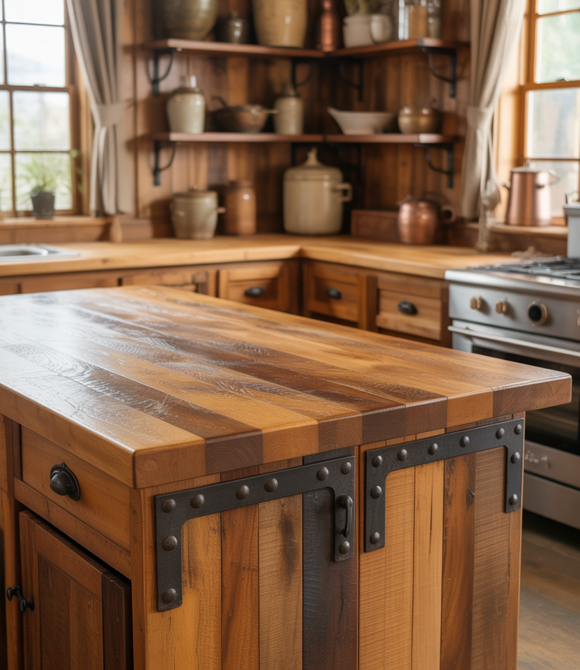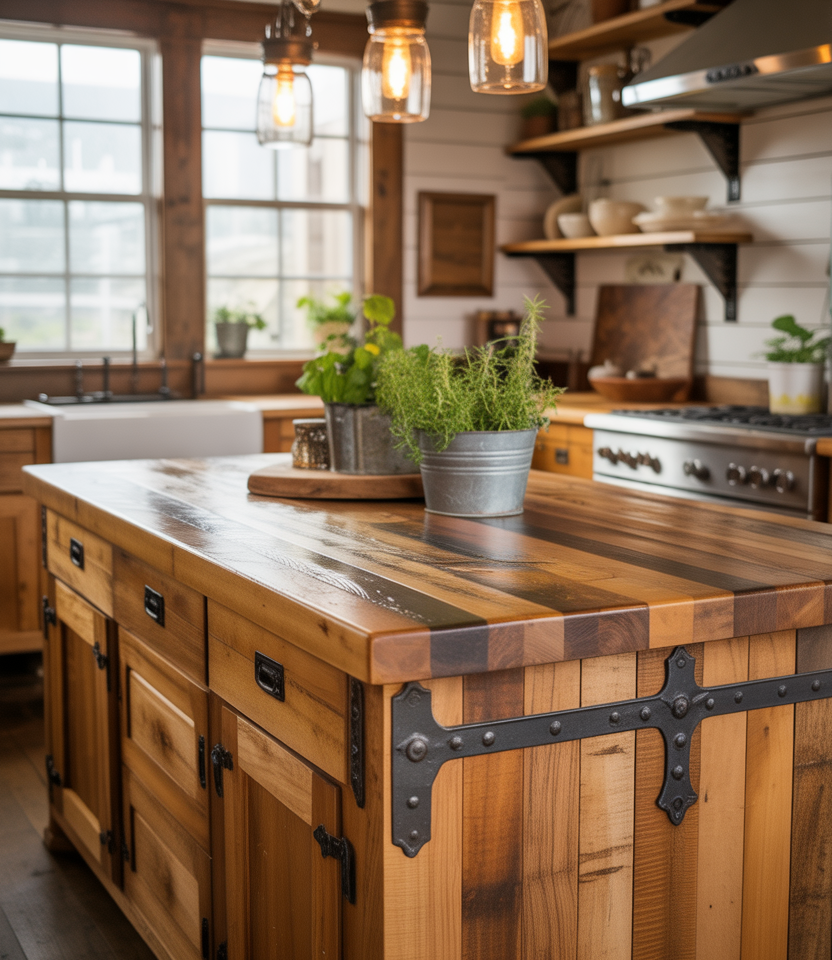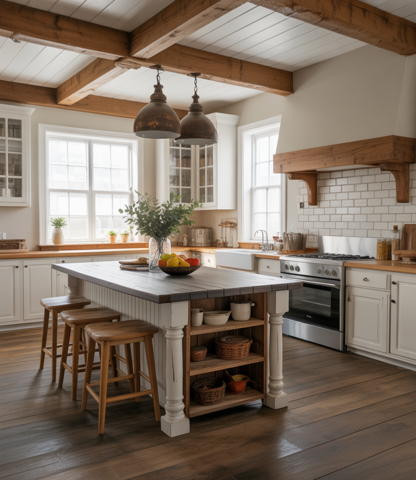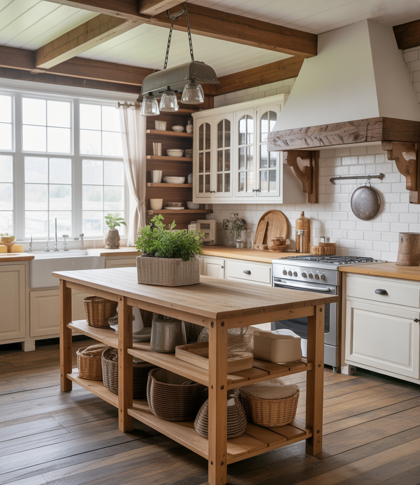 A rustic island with reclaimed wood brings warmth, especially in white kitchens craving texture. Add turned columns and antique-style hardware for charm. My aunt in Texas swapped her builder island for a reclaimed barn beam beauty—it instantly felt like a farmhouse magazine shoot. This idea pairs perfectly with cozy cottages, suburban homes seeking character, or rentals updated with freestanding pieces. Mix modern faucets near the sink for contrast, and finish with soft, earthy linens and maybe a vase of wildflowers.
