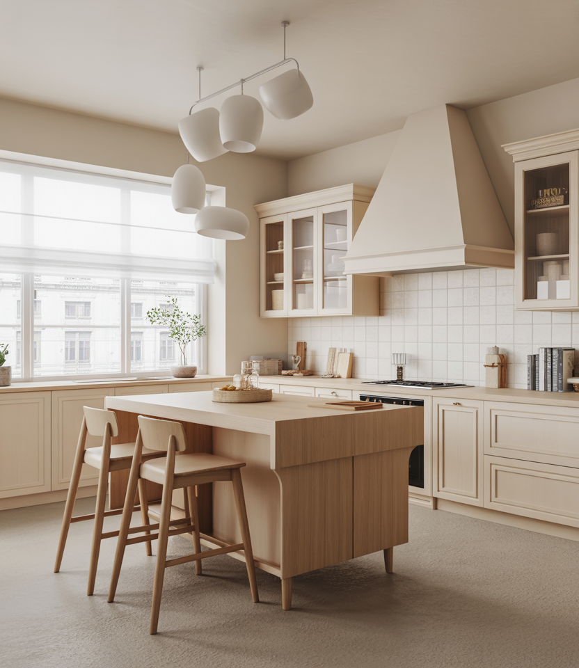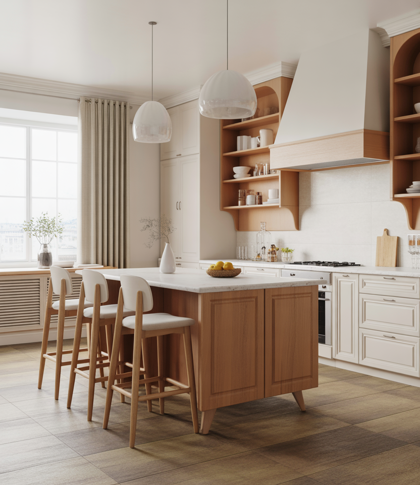 A furniture-style island with tapered legs or carved columns instead of a box base feels airy and unique. This design is ideal for narrow kitchens or small-space townhomes that seek visual breathing room. Use white or white oak finishes to keep it light, then slide bar stools beneath for everyday seating. Like a refined table in a European bakery, it blends cooking and dining beautifully—and friends always comment how “it doesn’t look like a kitchen at all.”