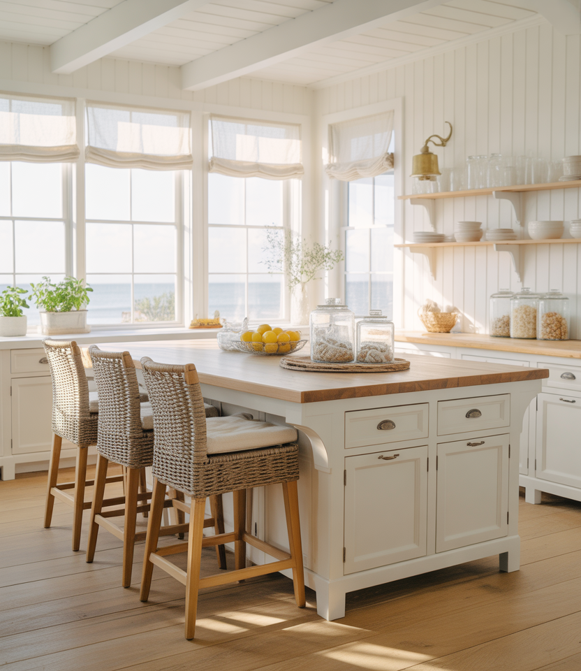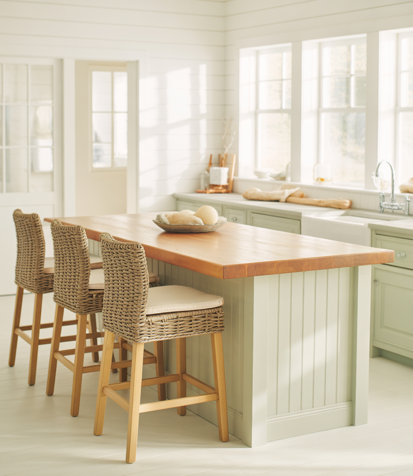 Soft white, sun-washed wood, and woven bar stools give this island coastal calm. Perfect for outdoor-adjacent kitchens or open- living layouts where airiness matters. A curved corner or round detail adds vacation softness, while light blues and natural rope touches feel like beach weekends even in landlocked towns. Great for homeowners who crave calm, breezy mornings and iced coffee prep at the Sink with light streaming in.